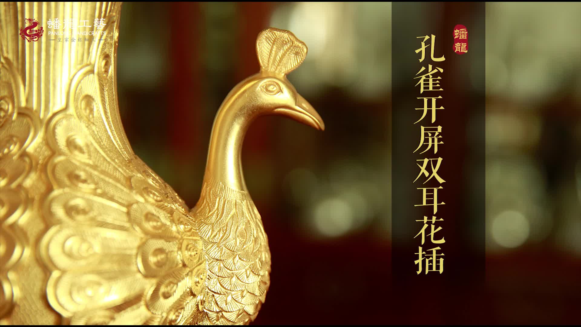 此器采用孔雀开屏造型,两只孔雀的头部成为花插双耳,翅膀相向巧妙设计成瓶身,尾羽高高耸起成为瓶颈,沿口镶嵌绿松石,更显华贵。工艺师以高超手法,极具创意的将孔雀开屏造型融入花插设计,技艺娴熟,刀工流畅,在静态中展现动感之美。细微处更是一丝不苟,羽冠弯啄,脖颈短毛,翅羽眼圈,被錾刻得十分逼真,可谓娉婷悦目,美不尽言。孔雀是百鸟之王,在古文中也有记载,孔雀开屏是吉祥之兆,能够辟邪保平安。孔雀美丽而德高,所以在明清两朝文官的官服上都有孔雀图案,孔雀成了官阶,职位,权力的象征。此花插加入鲜花更是雍容华贵,明艳动人,寓意官运亨通,加官晋爵。