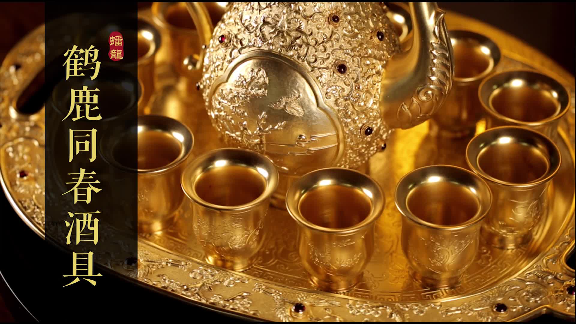该套酒具采用皇家金银细工技艺纯手工打造,体型秀美流畅,色泽灿然华丽,纹饰寓意祥瑞,构图繁密有度,刻画流畅生动,工艺复杂细致,在49届全国工艺品、旅游纪念品暨家居用品交易会荣获2014年“金凤凰”创新产品设计大奖赛铜奖,实乃古代传统工艺之极致佳作,馈赠收藏上选之宝器。