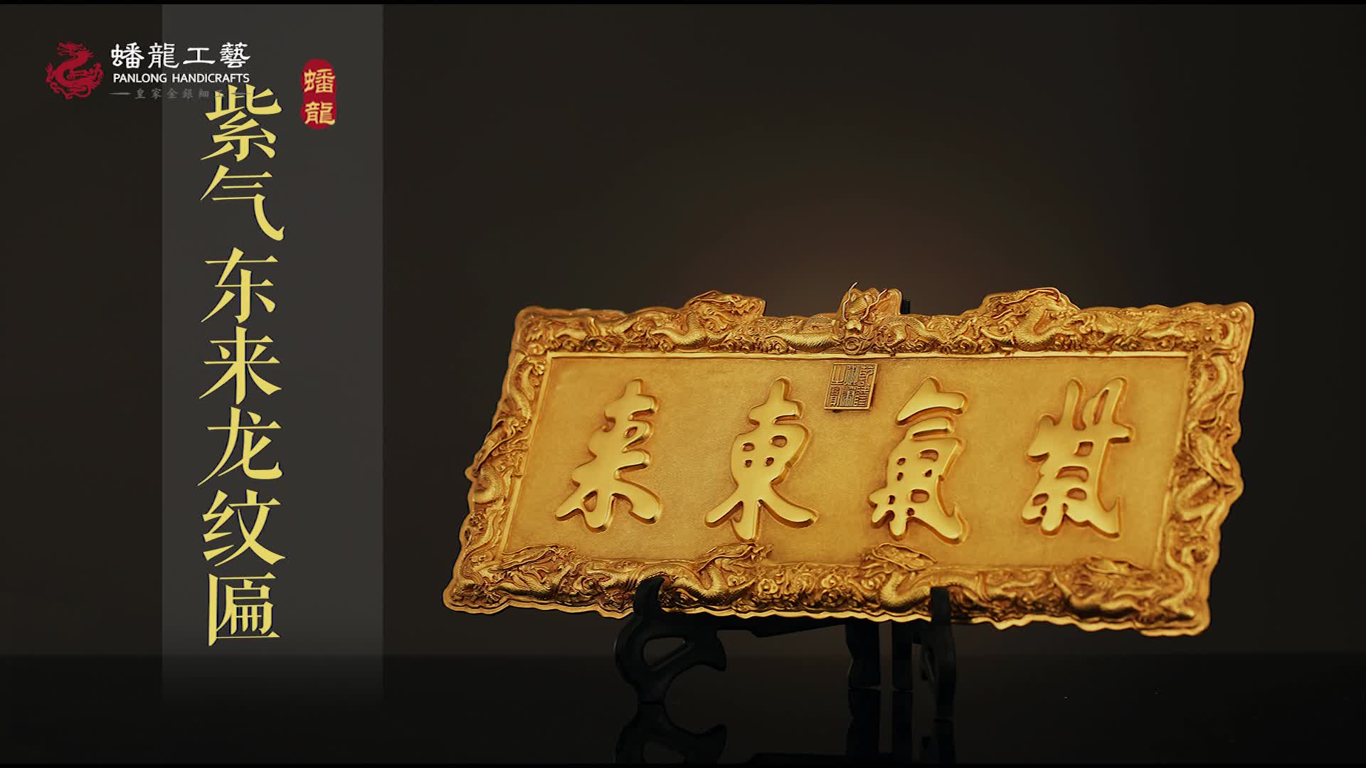 此匾以沈阳故宫博物院收藏的“紫气东来”金漆赶珠龙纹匾为原型,由工艺师采用高浮雕錾刻技艺精心制作而成。中间为乾隆帝御笔亲书“紫气东来”四字,题字上部中央有阳文篆书“乾隆御笔之宝”玺印,四周錾刻9条栩栩如生的飞龙,祥云缭绕,气势磅礴,雍容华贵,持有此宝,定瑞气迎门,福报无限。
