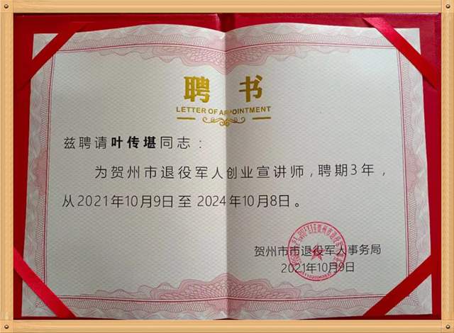 为响应国家大众创业、万众创新的号召,激发退役军人积极参与创新创业的热情,为大众创业、万众创新注入新的活力,广西贺州市退役军人事务局于近日特别聘请了90后退伍兵叶传堪为创业宣讲师。