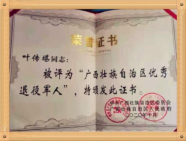 2020年7月,经上级党工委批准,“中国共产党贺州市捌壹投资有限公司支部委员会”正在成立,叶传堪出任党支部书记,并兼任贺州军分区综合救援排排长,还在2020年贺州市首届退役军人创业创新大赛中荣获第三名和广西退役军人创业创新大赛“优秀奖”。同时,还获得了贺州市八步区“优秀共产党员”、“广西优秀退役军人”等荣誉称号。