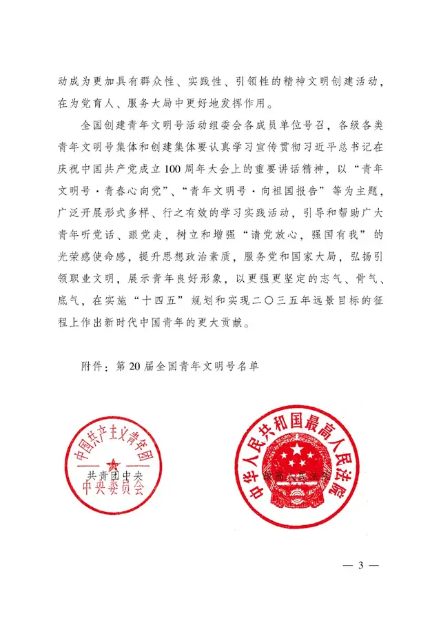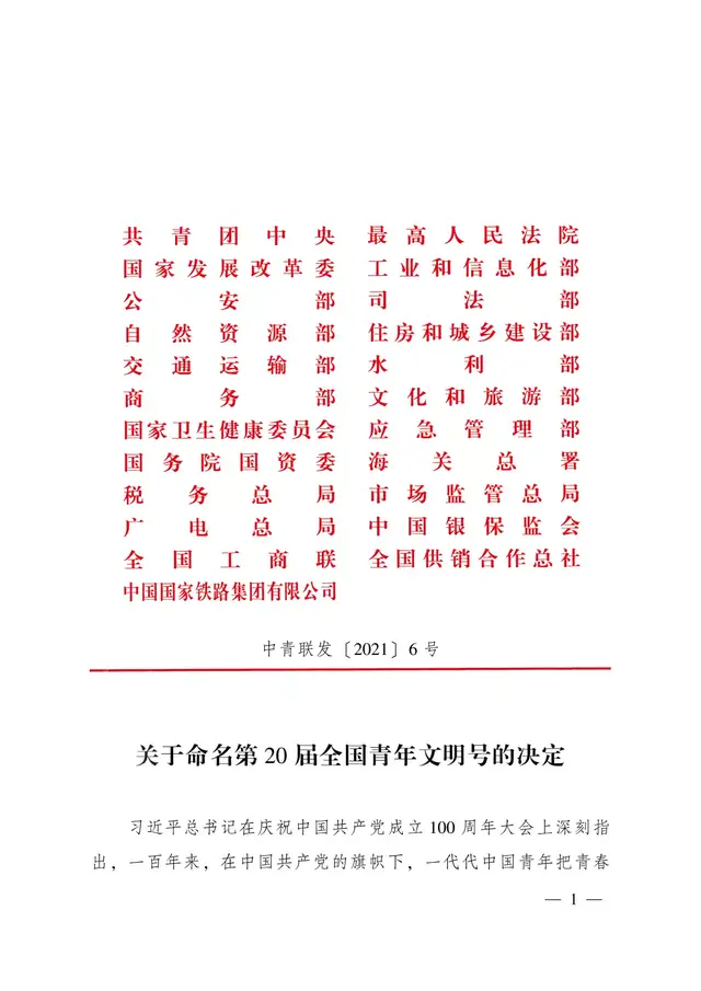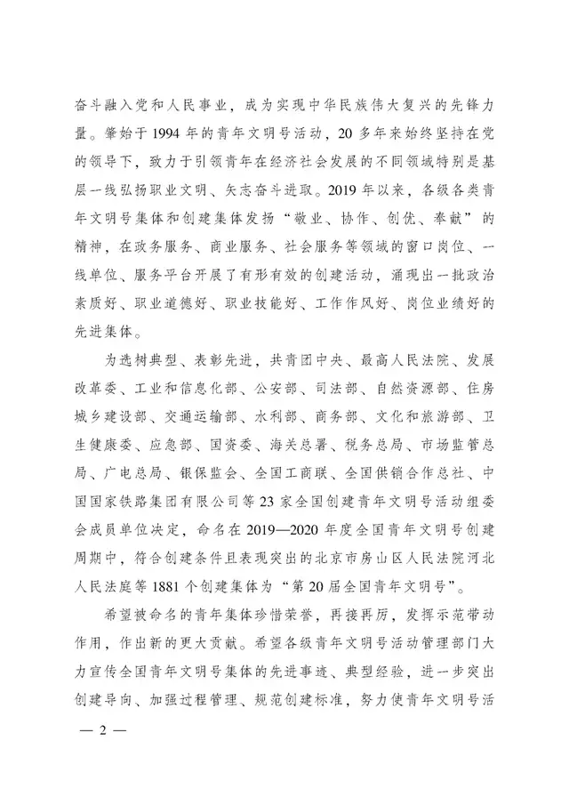 关于命名第20届全国青年文明号的决定