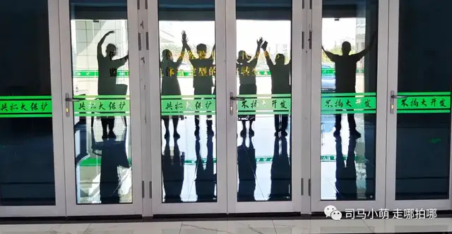 我发现指挥中心一楼大门的玻璃反光有点意思,于是大家假装“外星人”拍了张剪影。好玩嘛。