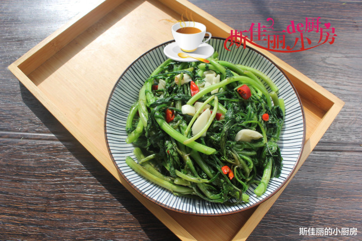 原料: 茼蒿 1盘 蒜 3瓣 红辣椒 2个 糖 1小勺 油盐 适量