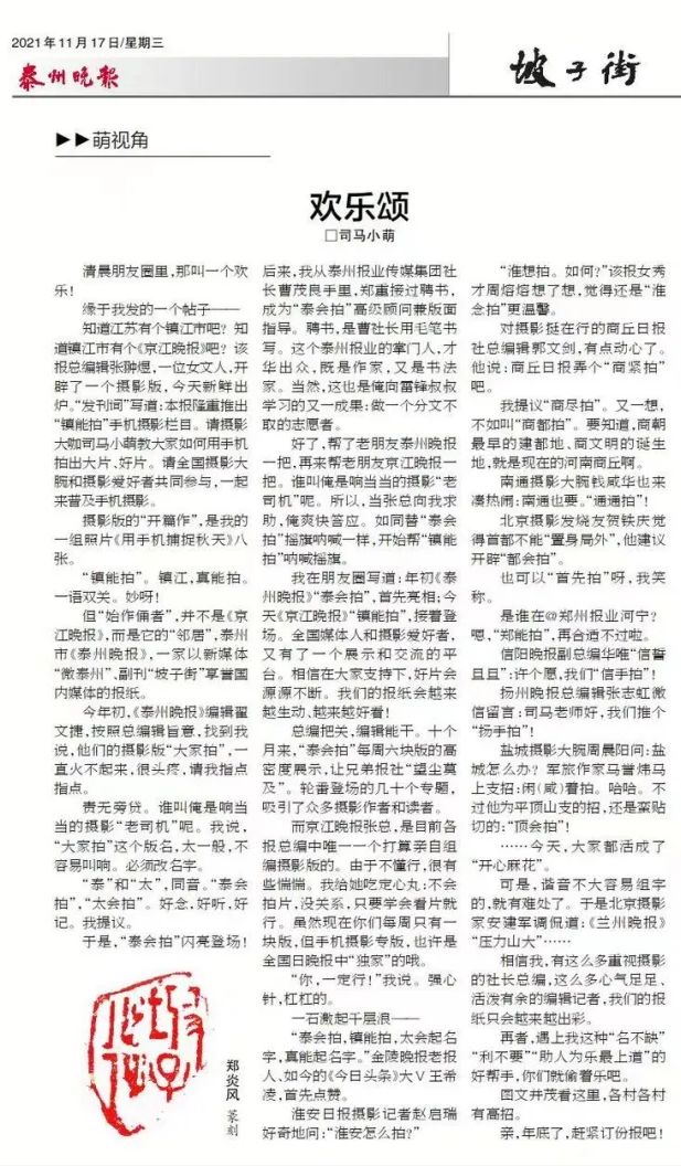 泰州晚报总编辑翟明在推送我这篇散文时写道:“亲,年底了,赶紧订份报吧!"这是司马小萌今天在坡子街《欢乐颂》一文的最后一句,也是为全国晚报做的一个广告,此文更是今年中国晚报发行征订的最佳文创,没有第二。