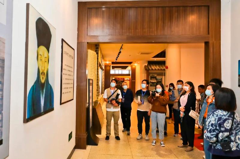 赣深高铁五城联合采访团记者在和平县阳明博物馆采访