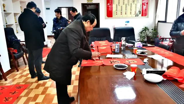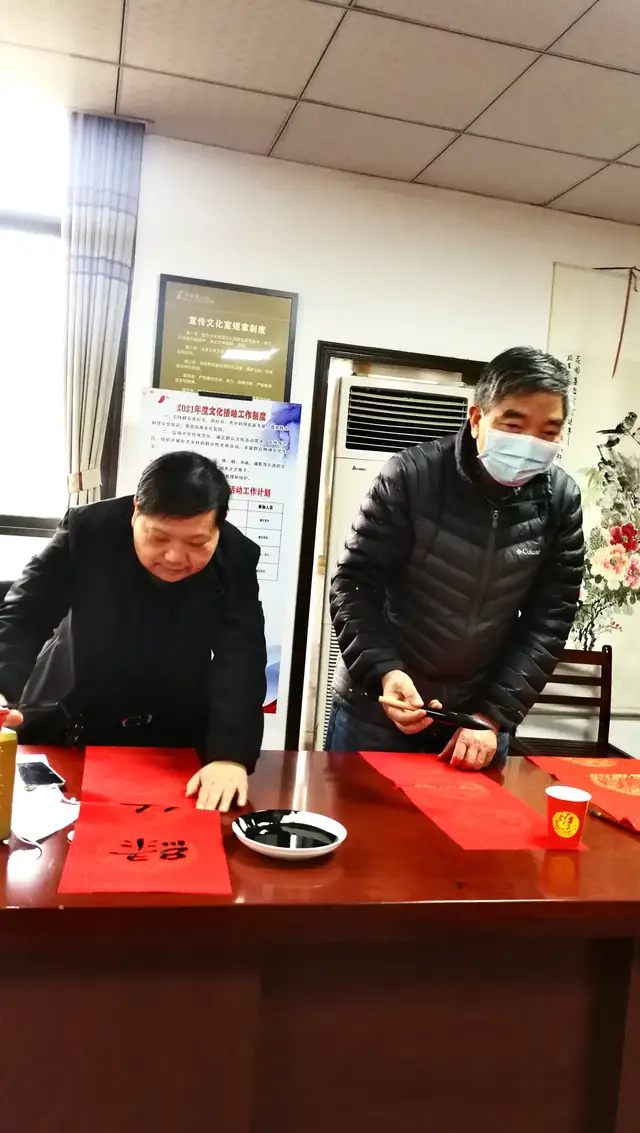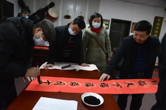 “丑去寅来千里锦,牛奔虎啸九州春”、“祖国与天地同寿,江山共日月齐晖”、“时来天地皆同力,春至草木共奋发”…… 在泽林镇文化站二楼活动室内,来自省直机关的五位书法家并排展纸挥毫,书写着寓意吉祥的春联和“福”字,现场红红火火,暖意融融,一派欢乐祥和的气氛。