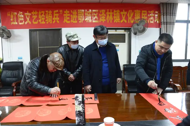 湖北省公安厅原副巡视员、省直书法阚成琳;省农业发展中心处长、省直书法家郑先荣;省自然资源厅老干处原处长、省直书法家余治国;省自然资源厅耕地保护处原处长、省直书法家徐顺华;《派出所工作》湖北工作站站长、省书协省直分会副会长兼秘书长郭永安等人组成省直书法家小分队走进鄂州市鄂城区泽林镇挥毫泼墨,写春联、送“福”字。