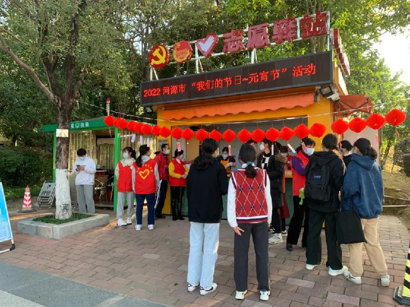2022年2月15日,团河源市委、市志愿者联合会组织志愿者在市区茶山公园、客家文化公园、东江湾公园、文化广场等志愿驿站开展“我们的节日·元宵佳节”庆祝活动,吸引许多往来的市民共同参与,感受元宵佳节的喜庆与热闹。