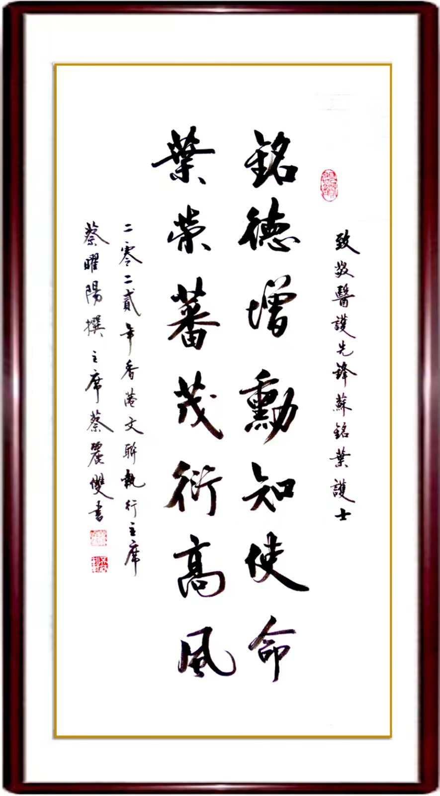 抗疫先锋苏铭叶护士,为了驰援香港,义无反顾地把双方父母亲千挑万选的婚礼推迟,随身携带定情信物来香港相伴,无私奉献的精神,令人肃然起敬。香港市民为之深深地祝福,为之撰书嵌名联:「铭德增勋知使命;叶荣蕃茂衍高风」!