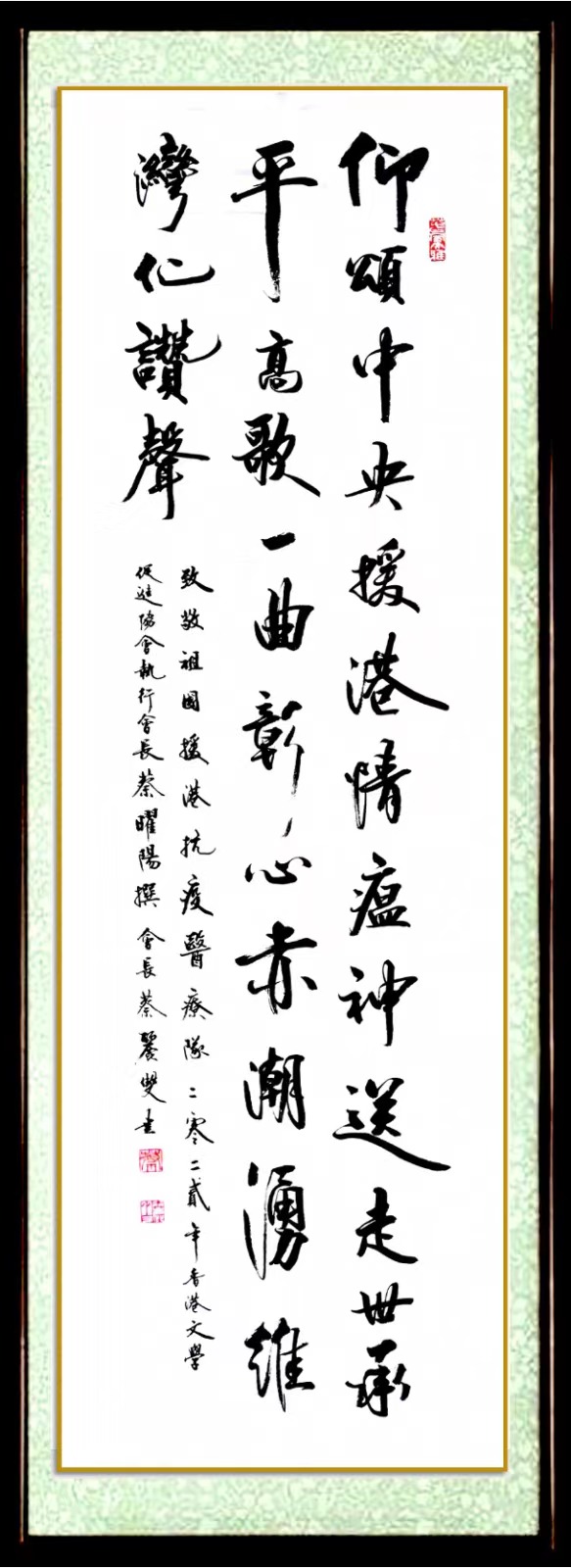 祖国啊!母亲,您一直把最宝贵的东西,赐给自己的儿女!我感恩地挥笔写下:致敬祖国援港抗疫医疗队「仰颂中央援港情,瘟神送走世承平。高歌一曲彰心赤,潮涌维湾化赞声。」
