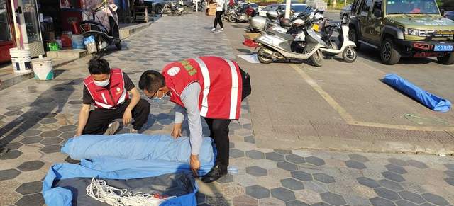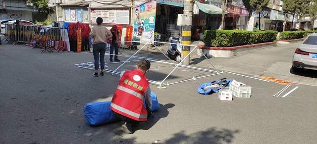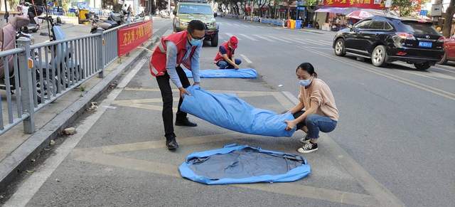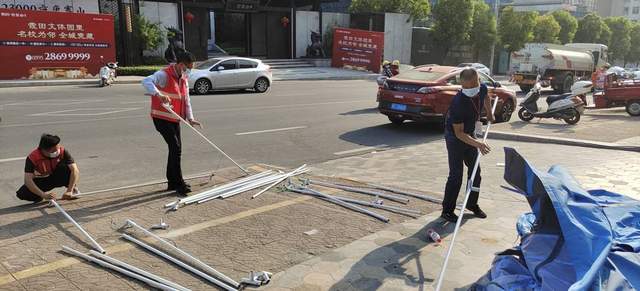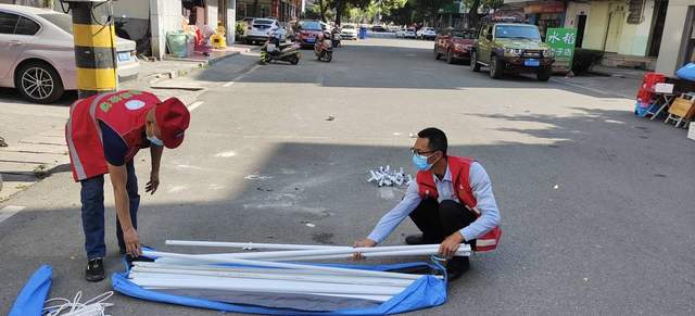 额角的汗水还没有干,志愿者们又来到了第二站湖前防疫点。先把交通路障集中归位,再收拾起帐篷。只见志愿者们轻车熟路地劳动着,互相配合,很快就完成了任务。