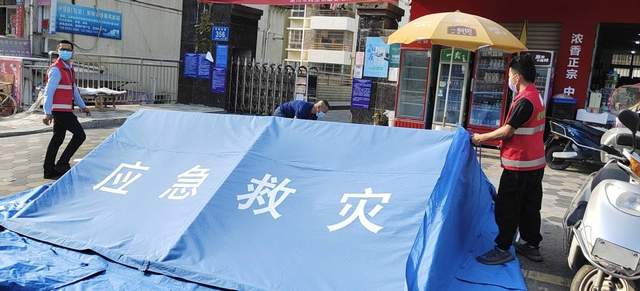 第一站是城南嘉园。面对临时防疫帐篷,志愿者们分工有序地开展工作。首先拆除帐篷内电灯线及其它物件,再解开帐篷内各部绑带,让4个支柱的弹簧钩脱离后降下帐篷,随后拿掉外面的篷布,于是整个骨架露了出来。再分两组收拾干净,一组折叠篷布,一组收纳帐篷骨架。这整个过程非常熟练,一气呵成,显然是平时训练有素的结果。