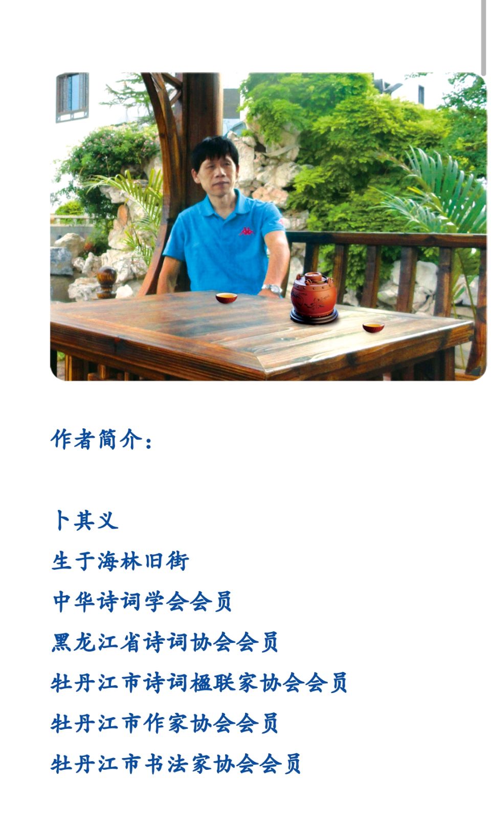 卜其义,男,1957年生于黑龙江省海林旧街。中华诗词学会会员,黑龙江省诗词协会会员,牡丹江市诗词楹联家协会顾问。牡丹江市作家协会会员,牡丹江市书法家协会会员。海林市亿龙水上风情园企划部经理。曾在牡丹江广播电视集团广告公司、《牡丹江日报》社广告部、牡丹江市邮政广告公司任部门主管。策划活动项目和市场营销项目100多项。出版《亿龙诗韵》诗词集两部,《峥嵘岁月》报告文学集。