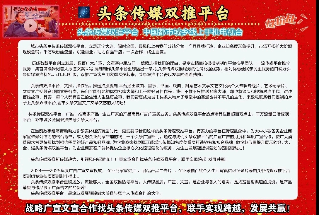 《都市头条传媒双推平台付酬诗刊》文学公益年度赞助播出鸣谢单位与个人: 大连明德高级中学、高氏庆生堂、华中堂中医馆、张克思书画艺术院、蓉花山酒业有限公司等广宣片 △