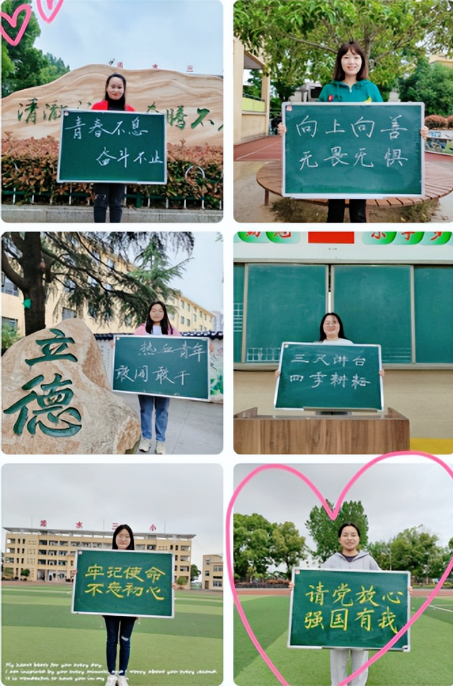 看,青年教师创意无限,她们在小黑板上写下自己的教育宣言,双手互传“接力棒”,相互鼓励,一起传递青春,做最美的追梦人。