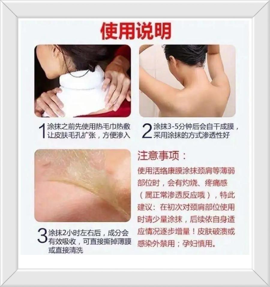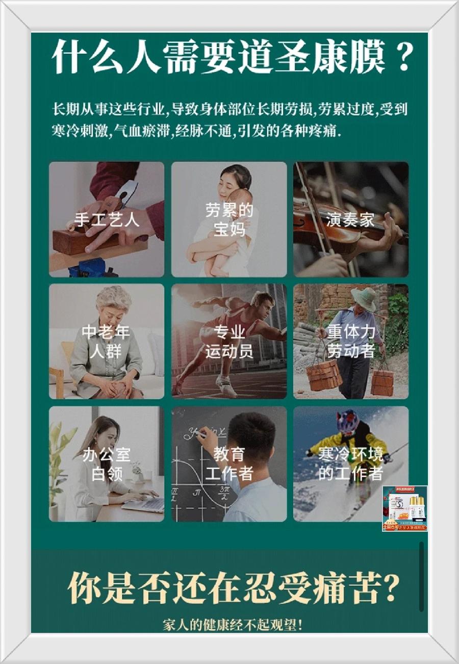 道圣康膜,它是黑龙江大众安泰药业有限公司生产。使用方法立用滚珠给药反复均匀涂抹患处肌肤,3—5分钟自干成膜,三秒钟进入表皮,六秒钟进入真皮,三分钟进入皮下组织,六分钟穿透筋膜和骨膜,触进血液循环,持续发热24~72小时促进人体代谢。打通经络,活血化瘀,舒筋活络,排湿除寒,软坚散结,它能使药效直达病灶,靶向修复,瞬间打通经络,激活受损细胞,调节脏腑功能,排出体内的风寒湿毒。