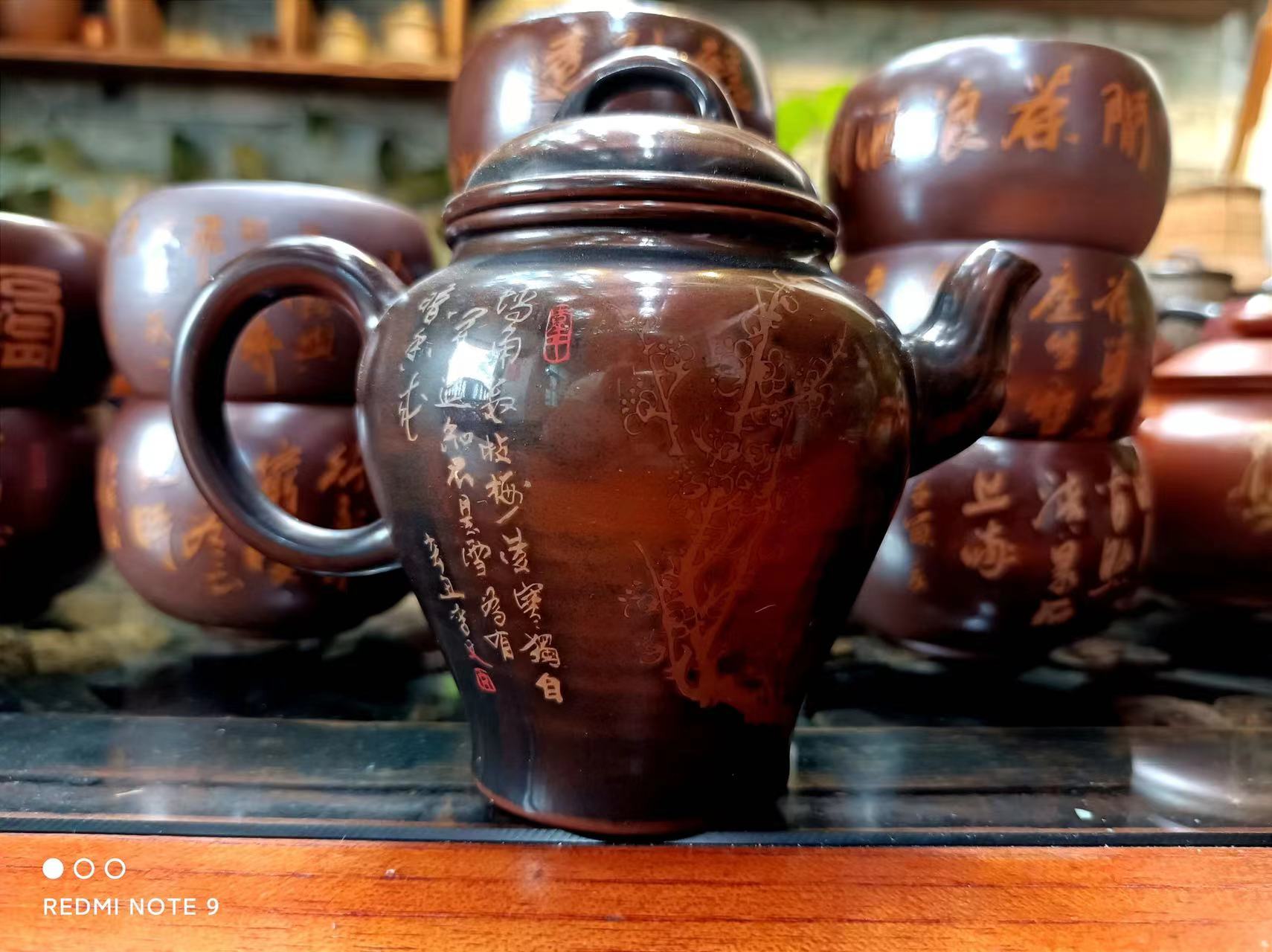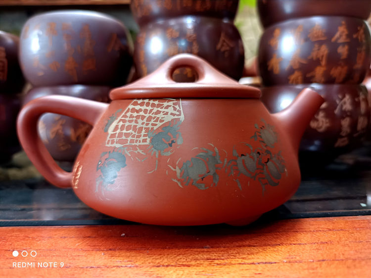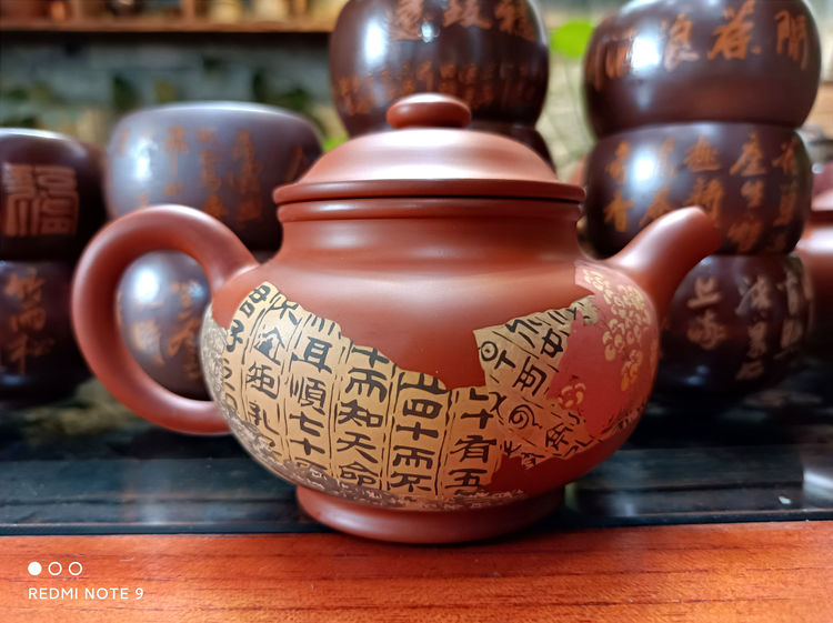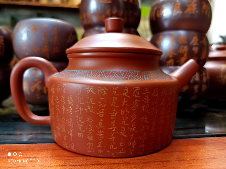 李文主要把心思集中在紫陶装饰及紫陶设计上,在湿坯上进行装饰,很考验书画装饰艺术水平。一般在紫陶壶的左右两边分别装饰为字画,一面是书法、另外一面是写意画或工笔画,这就十分考验书画艺术者的功力了。为了达到理想的效果,李文就反复在紫陶湿坯上练习装饰,壶的一面画上花鸟鱼虫,另一面写刻上中国的名诗名词。自己觉得不满意了,就刮掉重来,直到达到自己想要的效果。