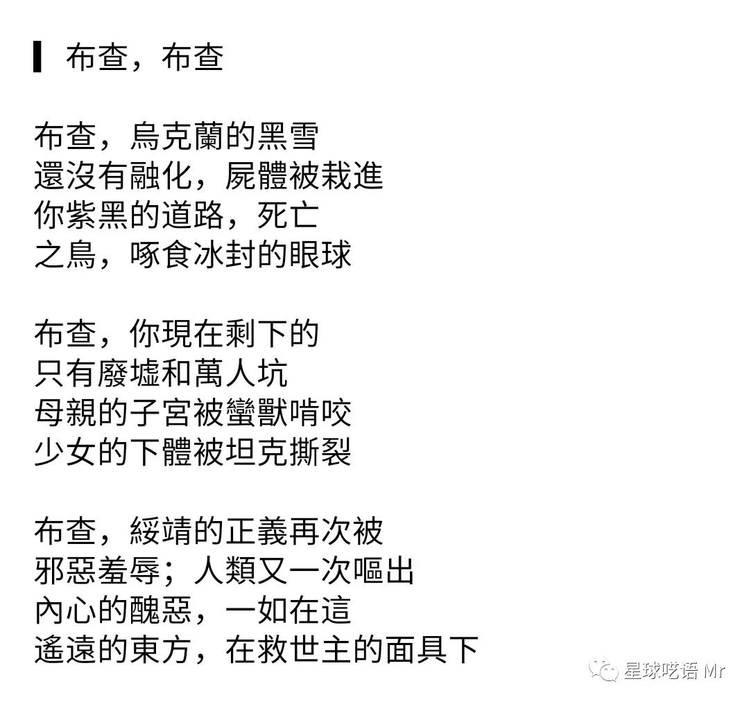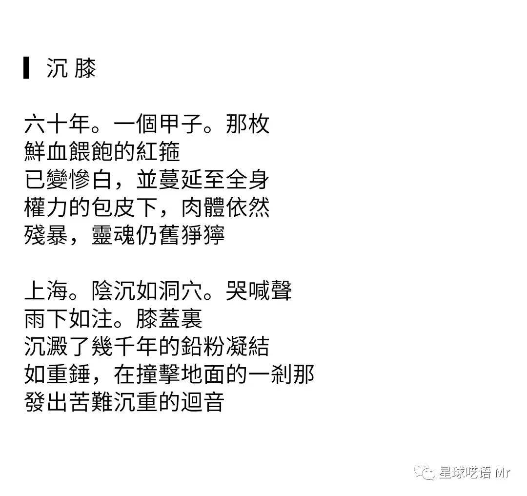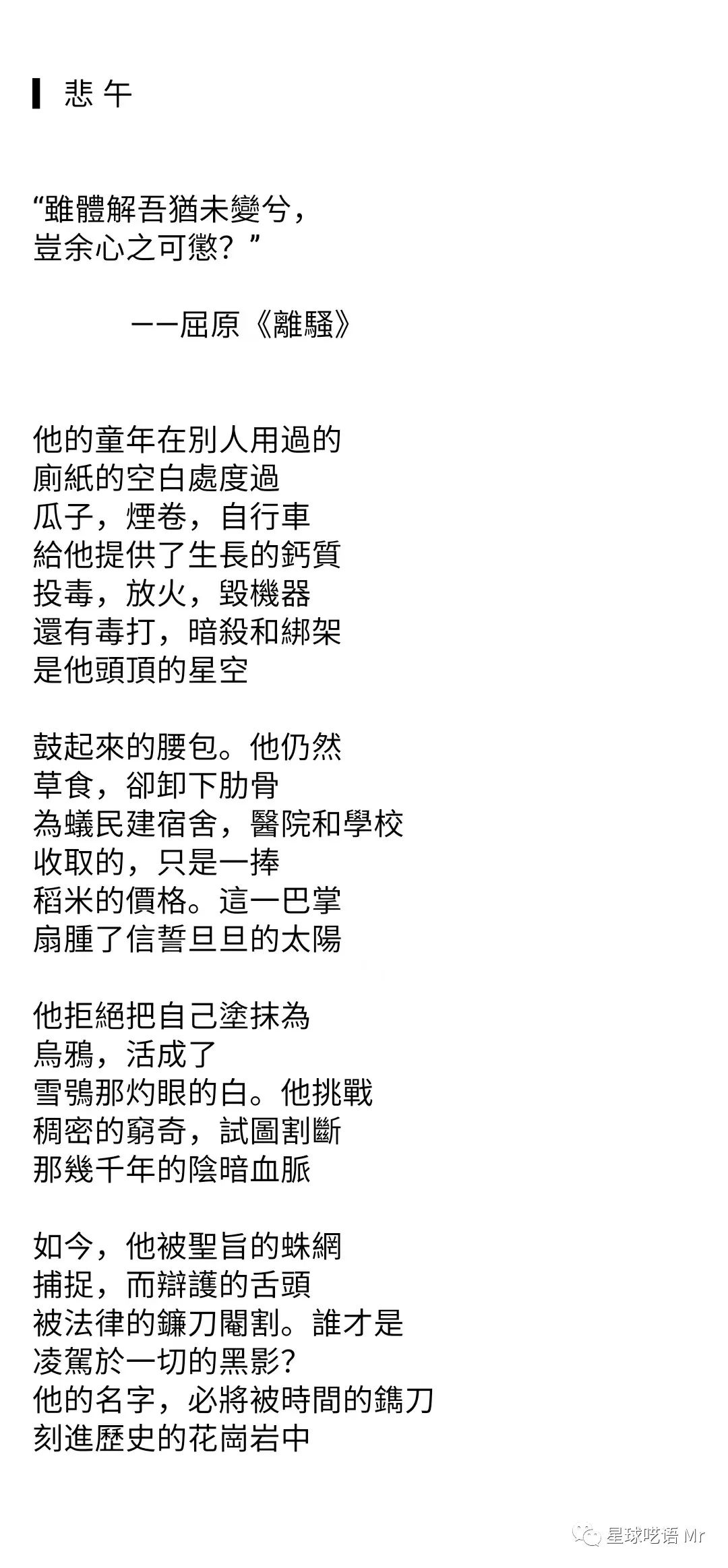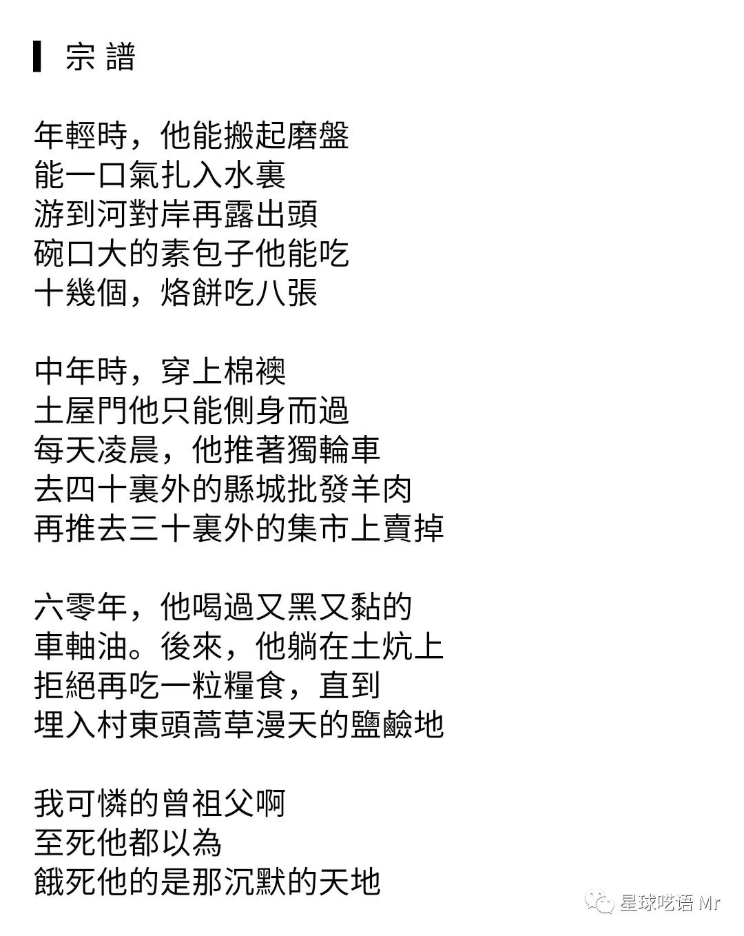 ▎逆流魚多少年來,這條河就這樣無休止地向迷茫的下游流去歡唱著,跳躍著帶著無數同樣歡唱和跳躍的泥沙這裏是我的家這裏有我的母親離開這裏我便不能活可是,我仍然憎惡這滔滔不絕的拼命流向下游的水而我,要拼命地往上遊往上遊遊到那遙遠的真實的快樂的痛苦的無奈的源頭▎高速月在墨藍的海面上浮著一個民族矯飾的面孔擦著借來的粉卻陶醉于將萬物照亮靜好的月光醃製魚蝦,自慰的潮水漫過崑崙而我愛的,是她荒涼的石頭,是那張因苦難而坑窪的臉