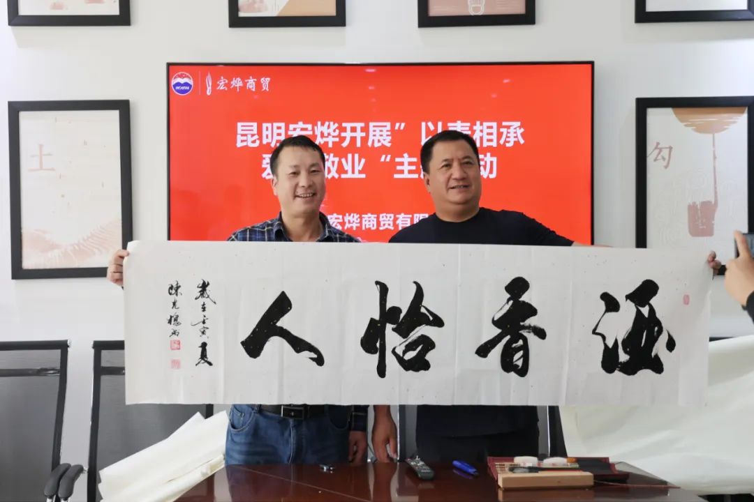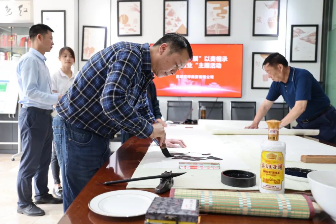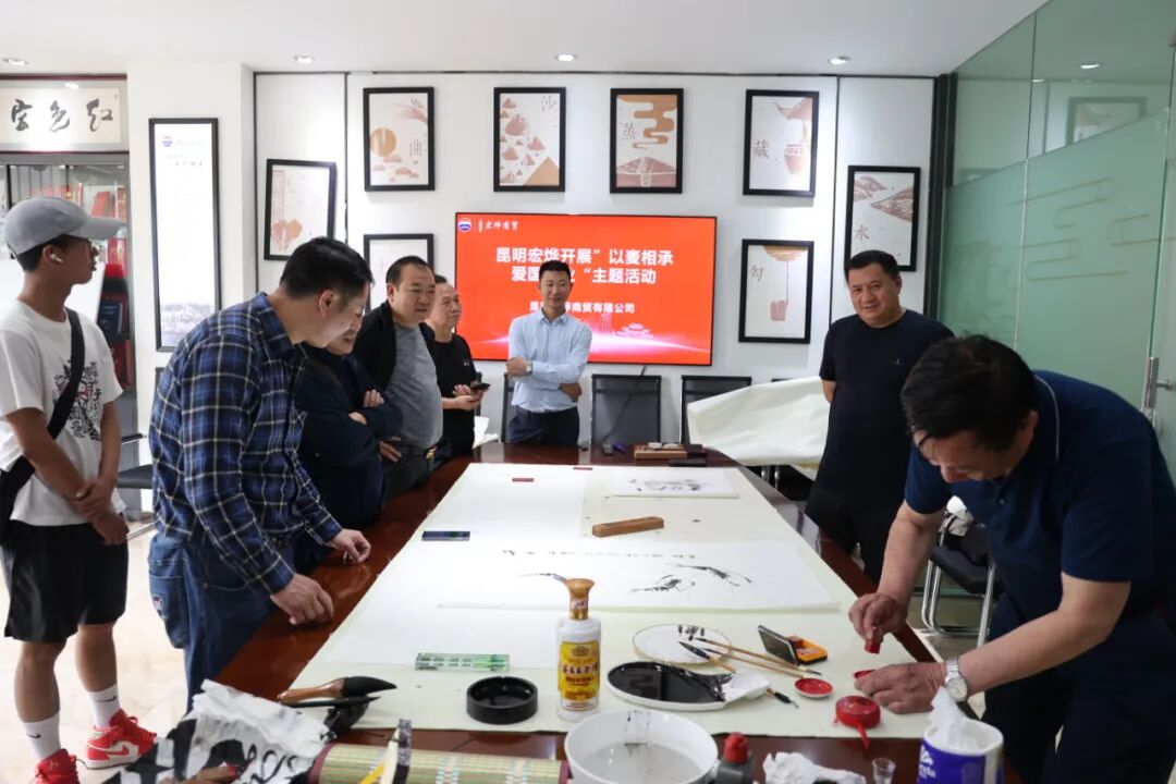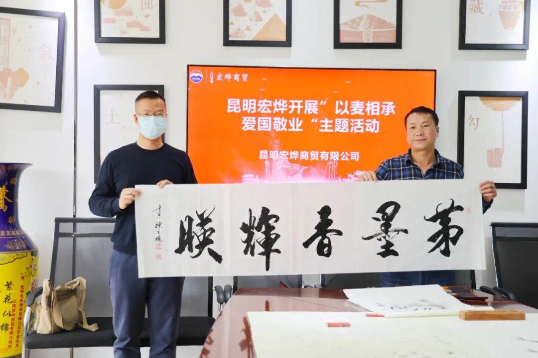在端午佳节来临之际,为弘扬民族精神,继承中华传统,于2022年6月2日昆明宏烨商贸有限公司在门店开展“以麦相传•爱国敬业”主题活动,特邀请一众茅粉及“中国一拳”之誉的拳书书法家向忠俊一行人到我司进行书法交流。