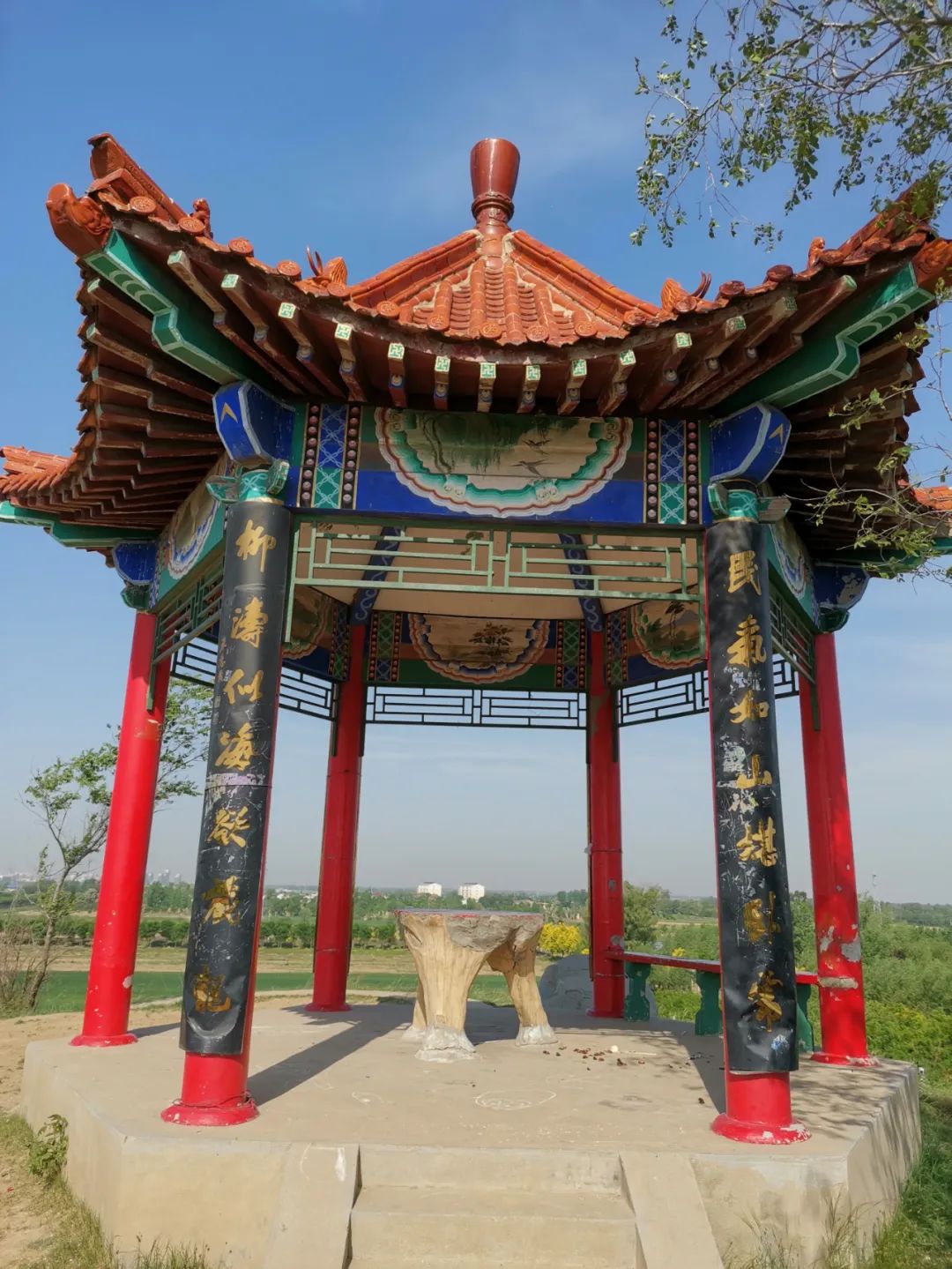 后来,当地政府在坟顶上修筑了一个六角小亭,飞檐翘角,彩绘梁坊,为坟丘添些现代况味。亭柱上镌刻献县书家朱惠民先生的两副对联,一联曰:民气如山堪卧虎,柳涛似海欲藏龙。一联曰:万古传承于今不朽,一经穷彻致远弥新。