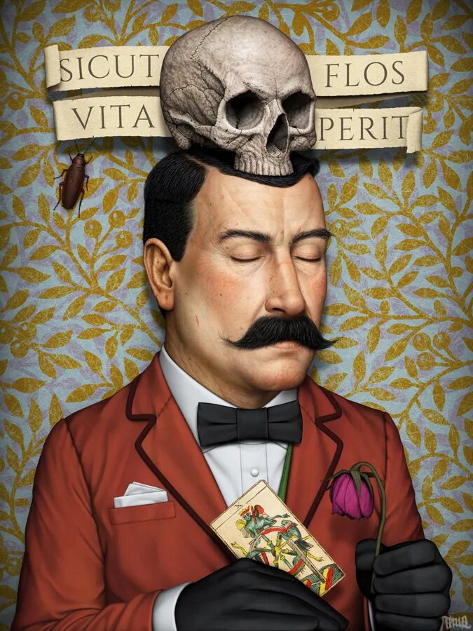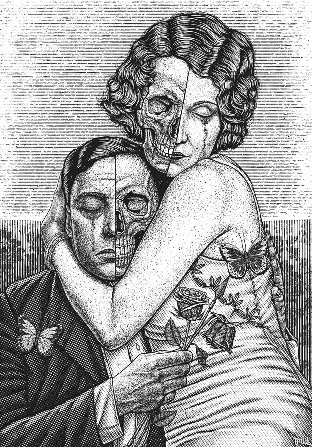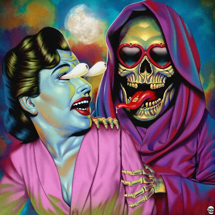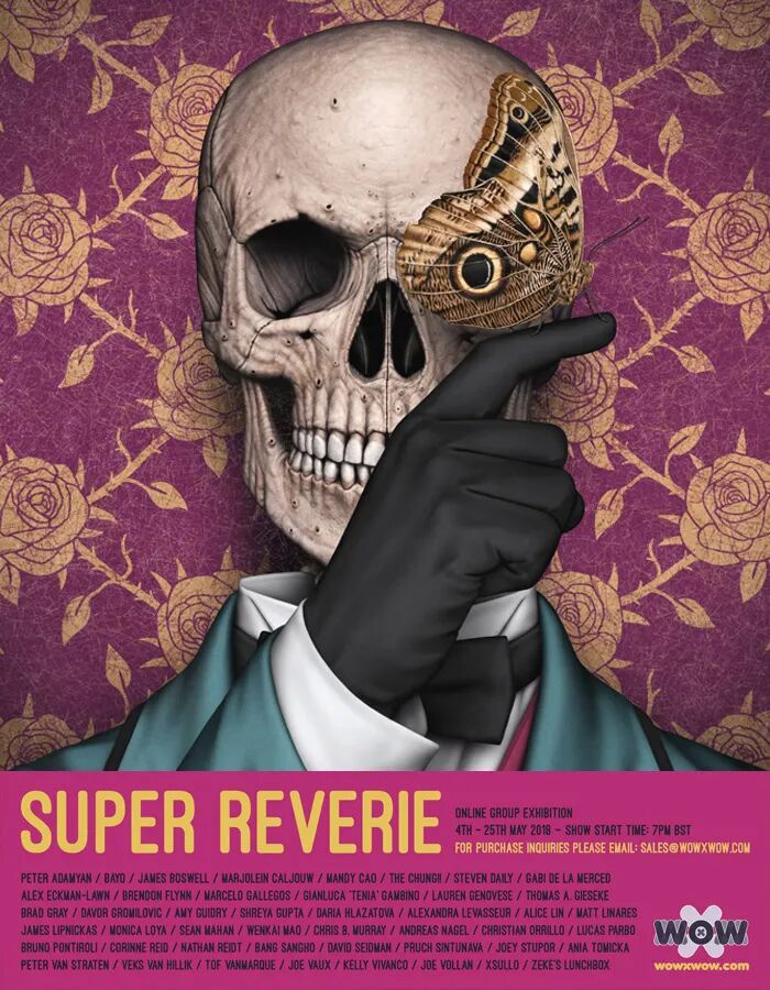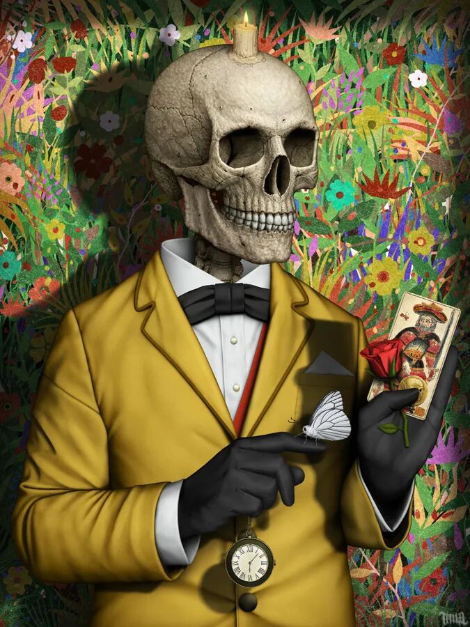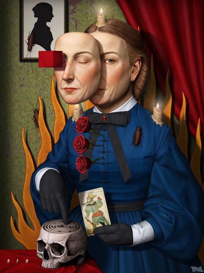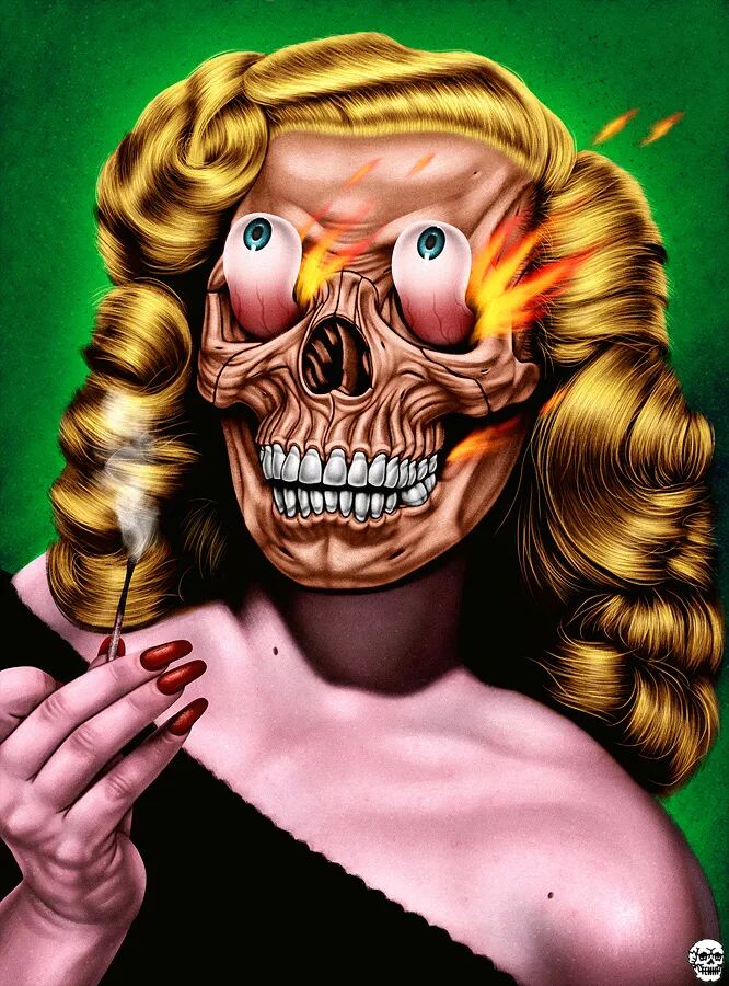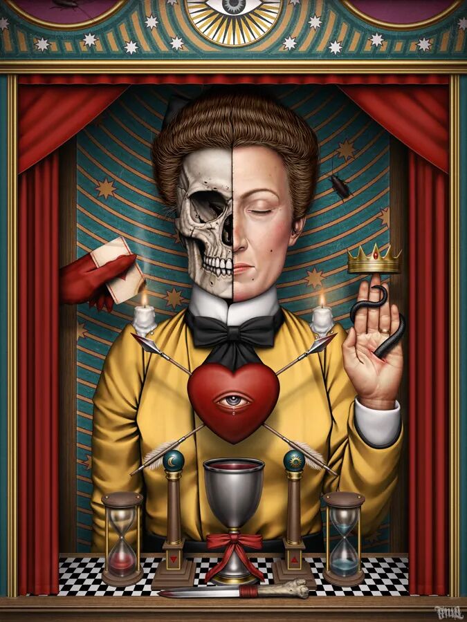 作品很多与生命的脆弱与短暂有关,开始与终点,通过人像的方式构成了超现实的表达。复古的画风与流行文化的结合,充满了黑色幽默。