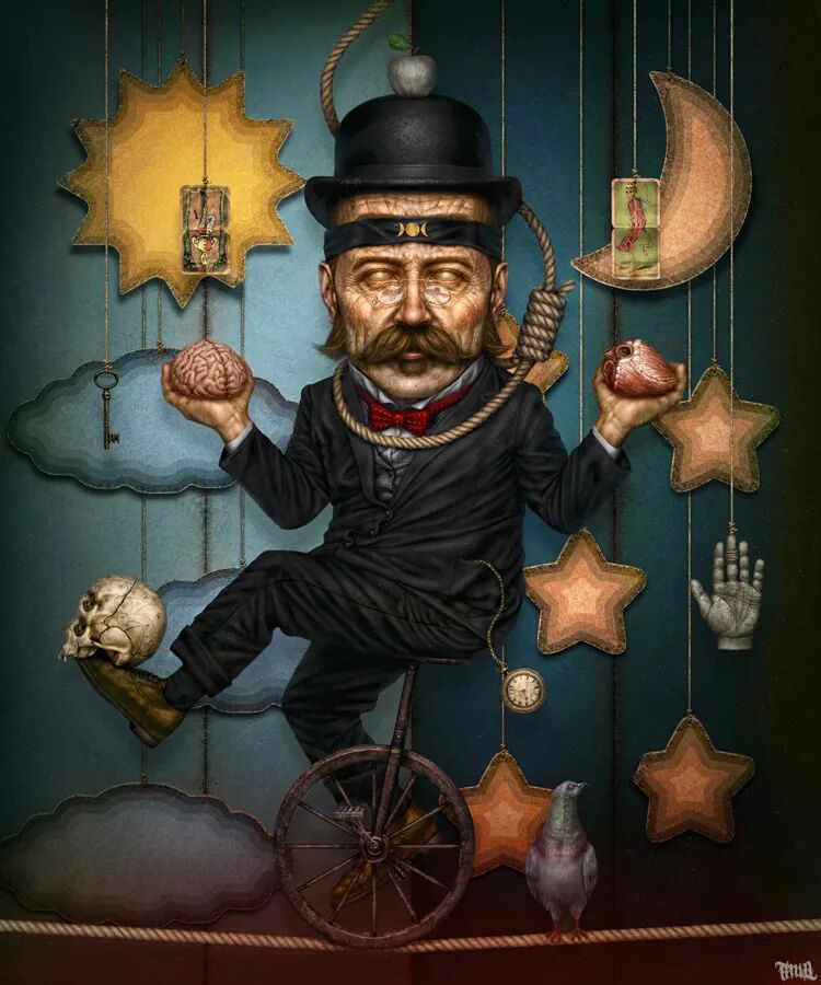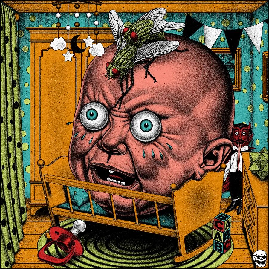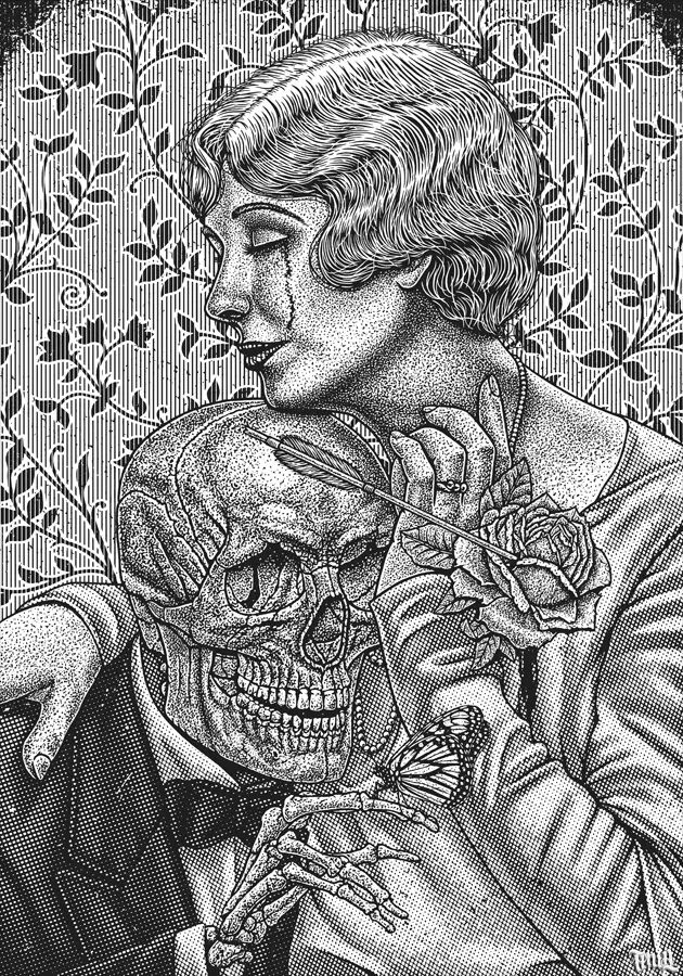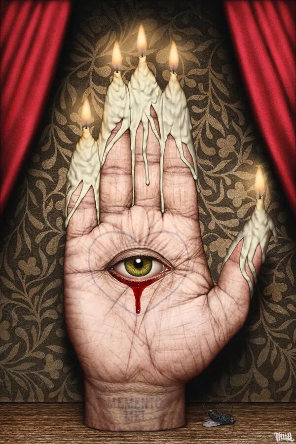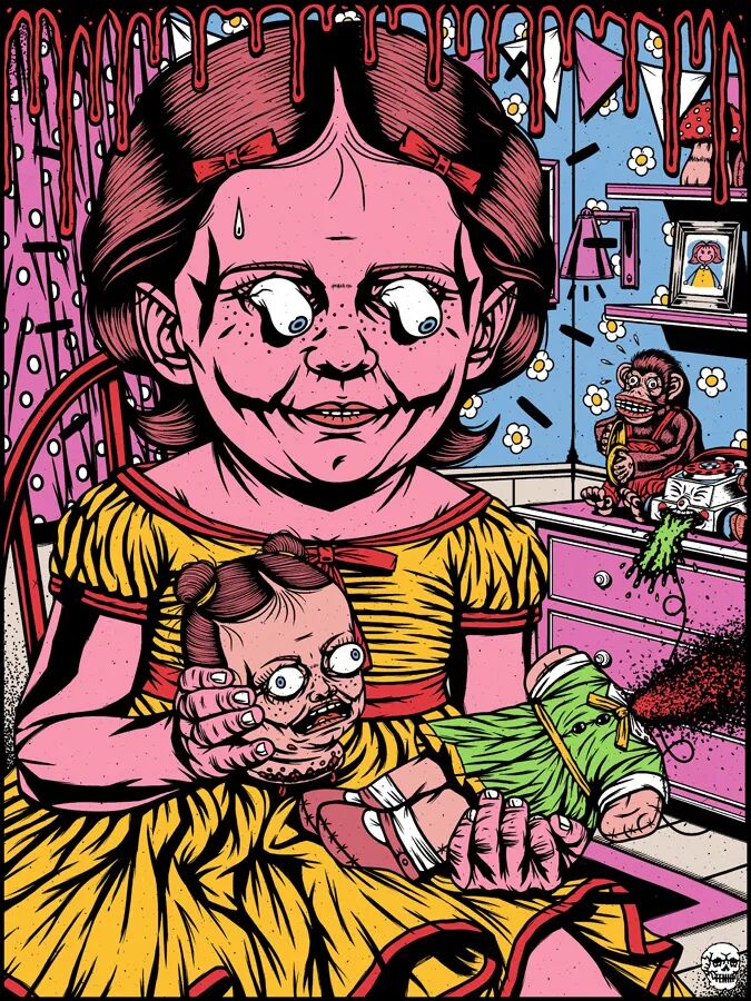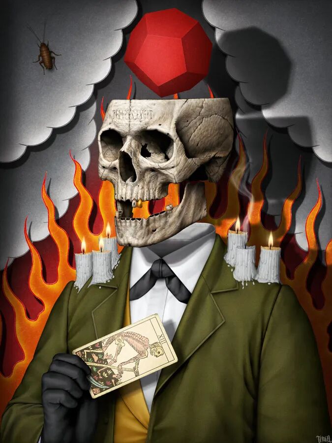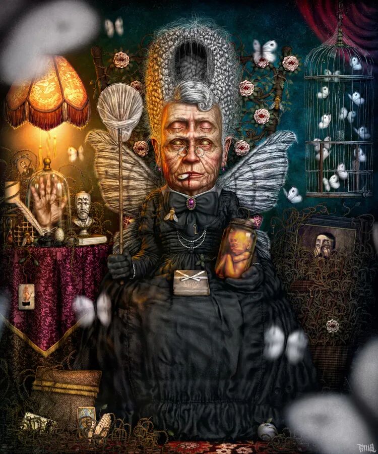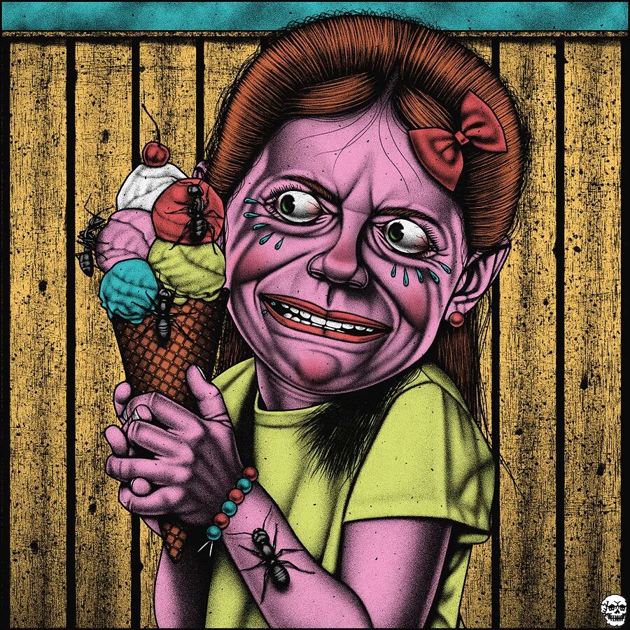 作品很多与生命的脆弱与短暂有关,开始与终点,通过人像的方式构成了超现实的表达。复古的画风与流行文化的结合,充满了黑色幽默。
