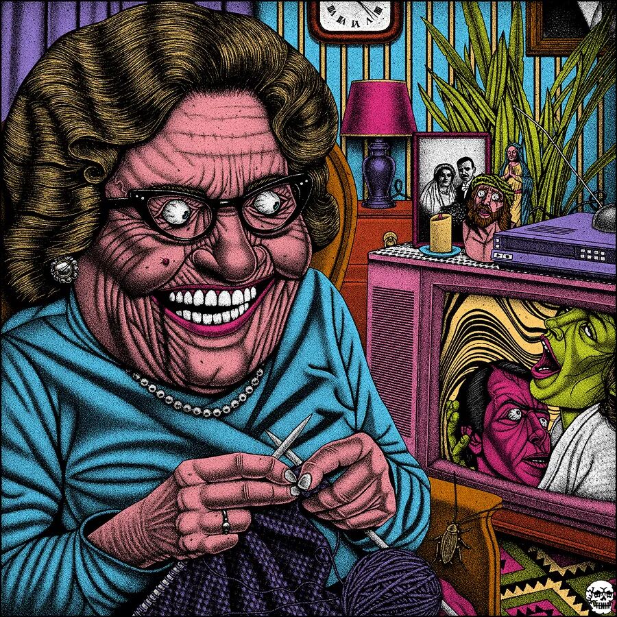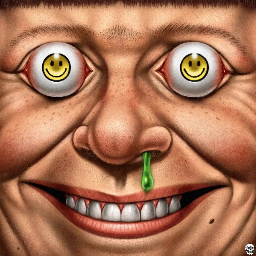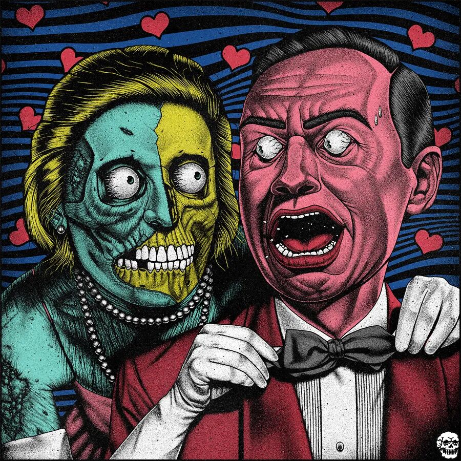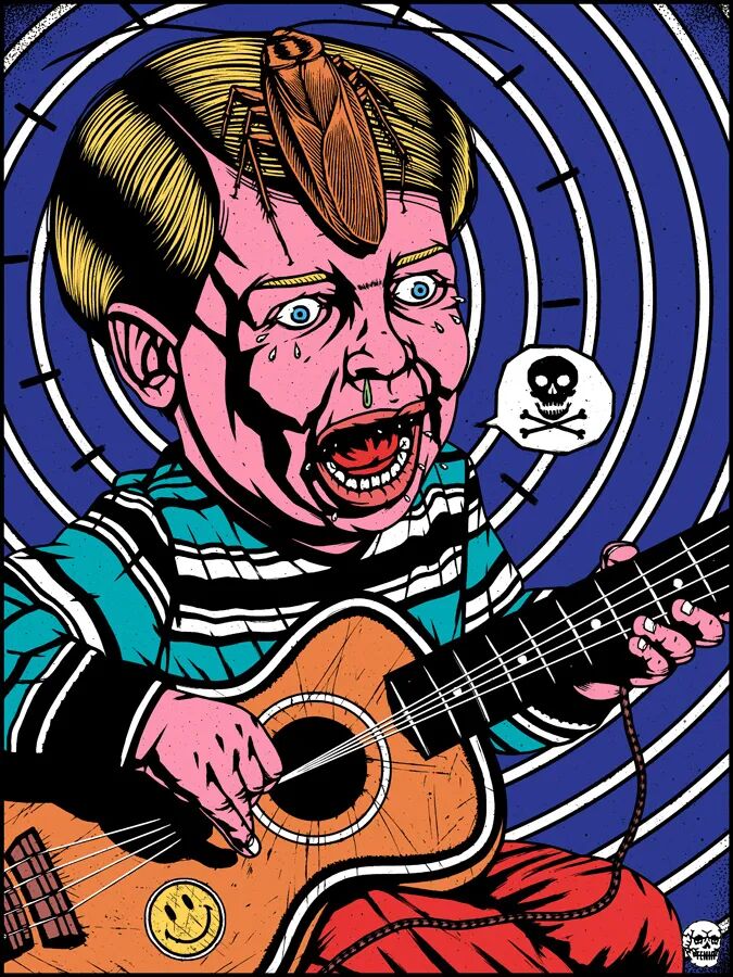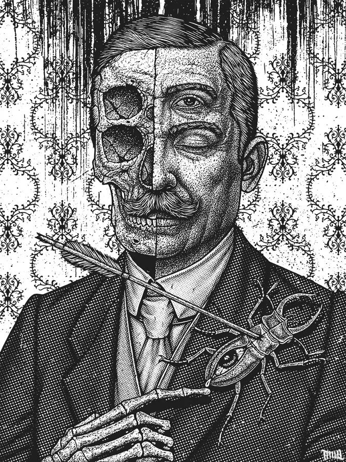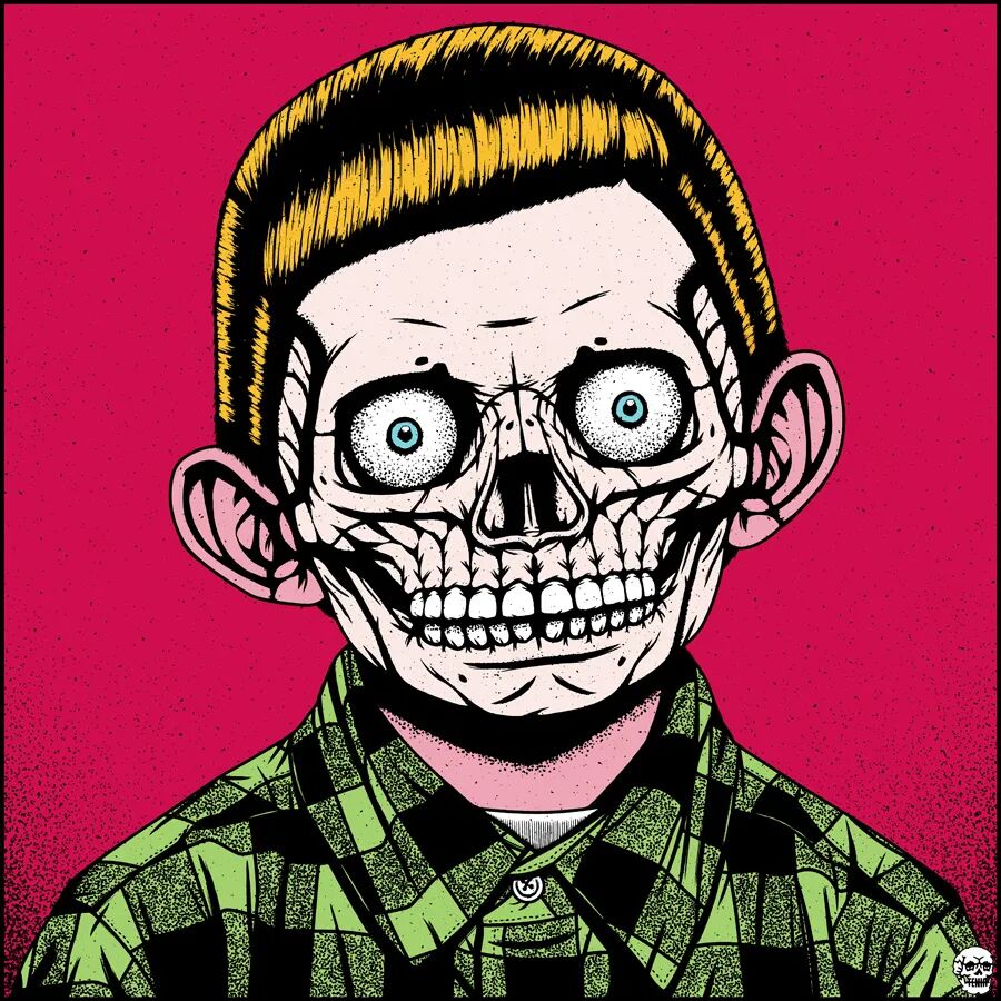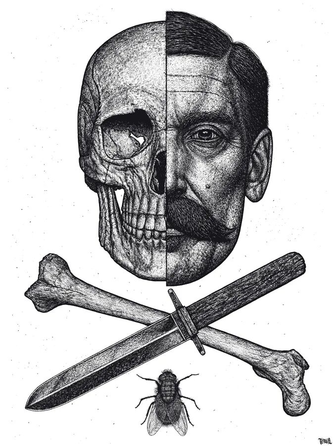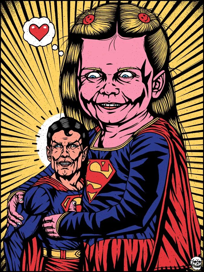 作品很多与生命的脆弱与短暂有关,开始与终点,通过人像的方式构成了超现实的表达。复古的画风与流行文化的结合,充满了黑色幽默。