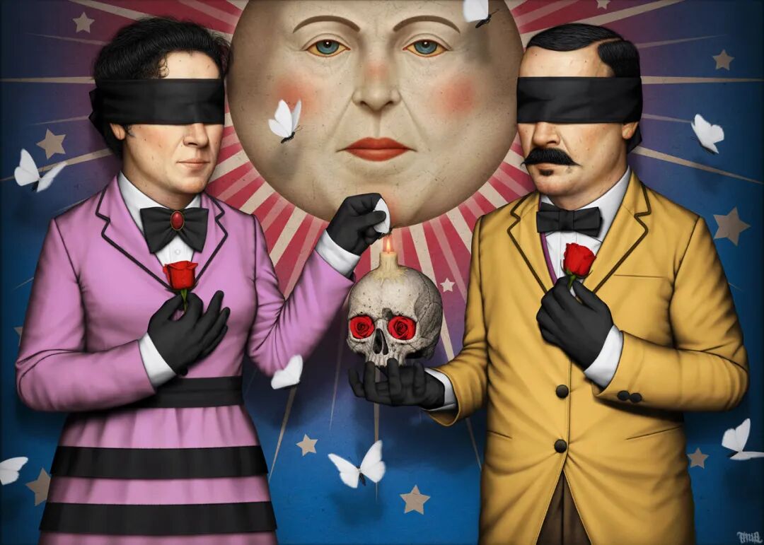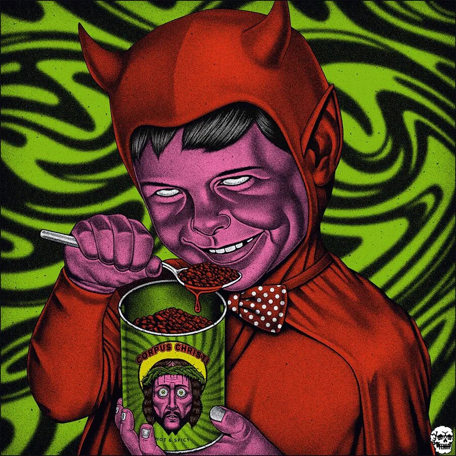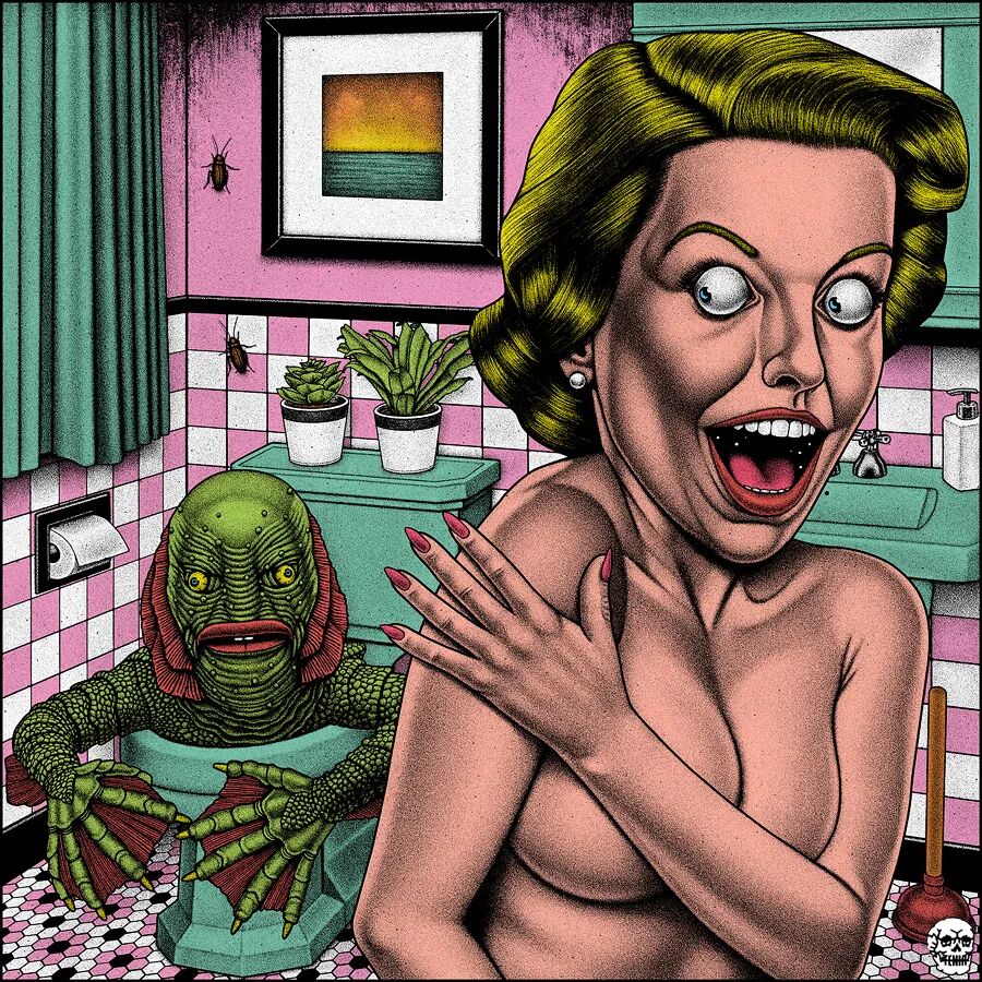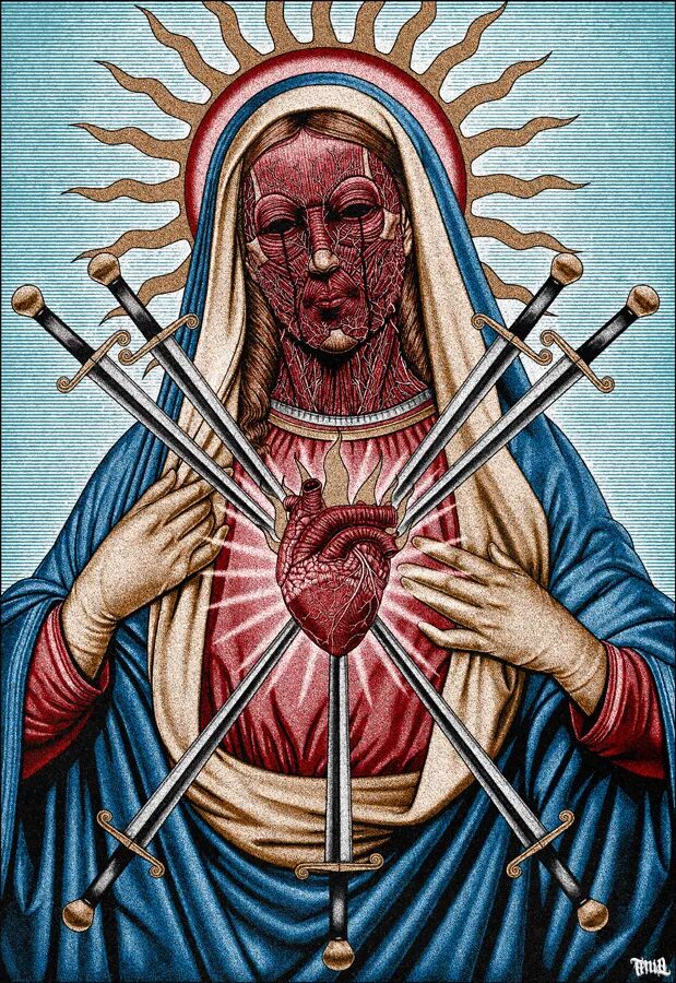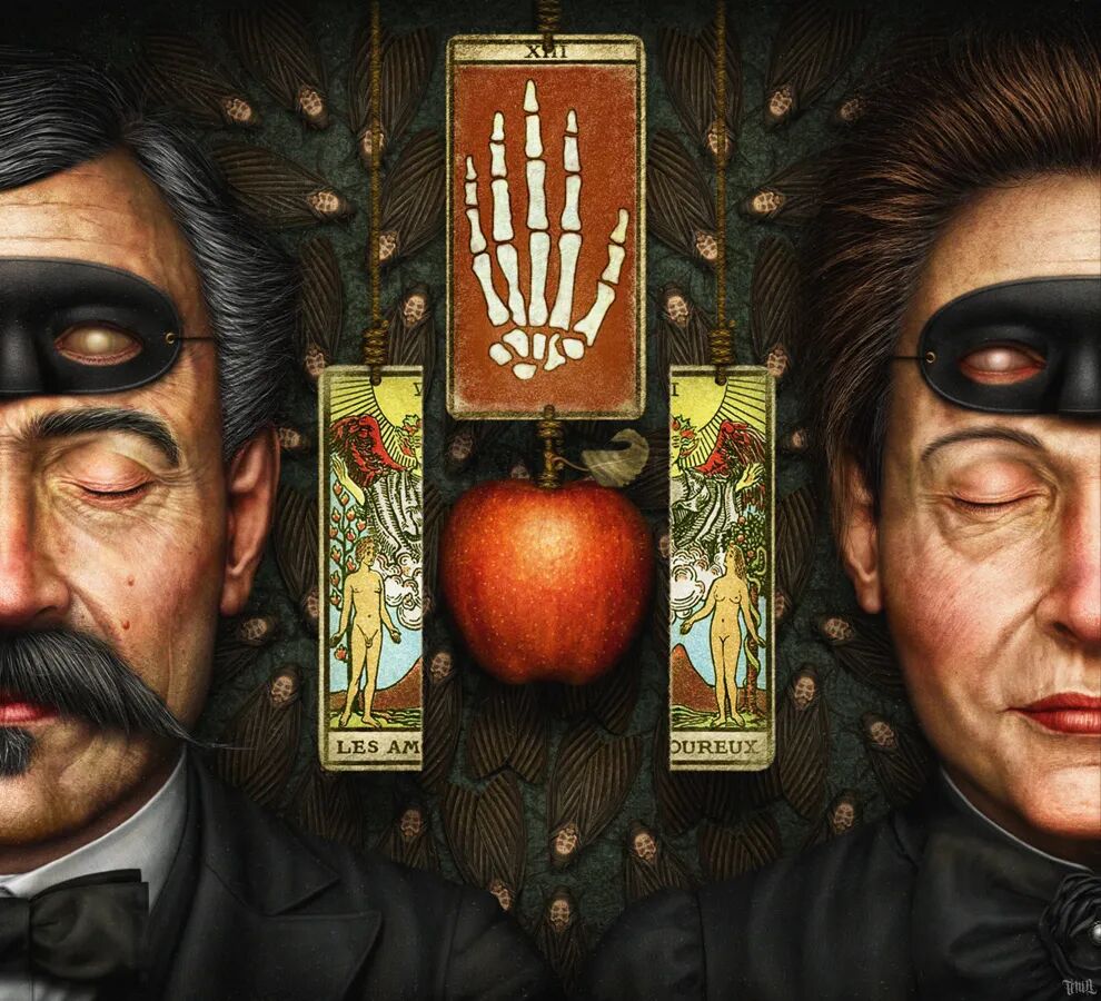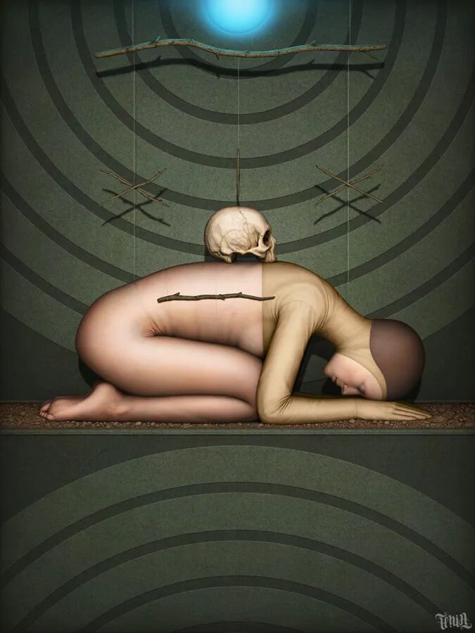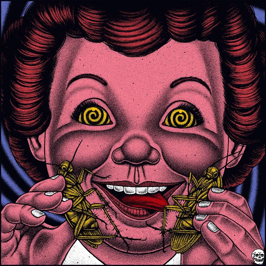 作品很多与生命的脆弱与短暂有关,开始与终点,通过人像的方式构成了超现实的表达。复古的画风与流行文化的结合,充满了黑色幽默。
