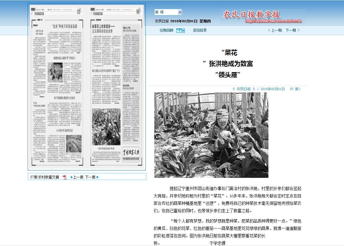 最美巾帼奋斗者,脱贫路上的巾帼致富带头人。2018年02月01日,《“菜花”张洪艳成为致富“领头雁”》被《农民日报》刊发;相序被中华全国总工会主管主办、工人日报社领导和管理的大型综合性中央新闻网站(中工网),云南省科学技术情报研究院《农村实用技术》期刊,以及今日头条、凤凰网等平台转发。