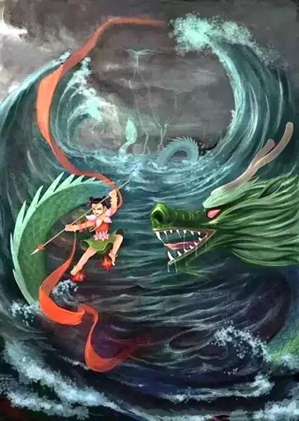 东海龙王父子称霸一方,经常兴风作浪,害得人们不敢下海捕鱼。哪吒决心治一治他们,为老百姓出一口气。 一天,小哪吒带上他的两件法宝——混天绫和乾坤圈,来到大海边。他跳进大海里,取下混天绫在水里一摆,便掀起滔天巨浪,连东海龙王的水晶宫也摇摆起来。龙王吓了一跳,连忙派巡海夜叉上去察看。 夜叉从水底钻出来,只见一个娃娃在洗澡,举起斧头便砍。小哪吒可机灵啦,身子一闪,躲过了这一斧头,随便取下乾坤圈,向夜叉扔去。可别小看这小小的乾坤圈,它比一座大山还重,一下就把夜叉给打死了。 龙王听说以后,气得嗷嗷直叫,就派他的儿子三太子带兵去捉拿哪吒。三太子跳出水面,气冲冲地对哪吒说:“你打死了我家夜叉,该当何罪?”说着,举枪便刺。哪吒一纵身,趁势抖出混天绫。那混天绫立刻喷出一团团火焰,把三太子紧紧裹住。三太子只好现出了原形。 从此,东海龙王再也不敢胡作非为了,人们又过上了太平日子。