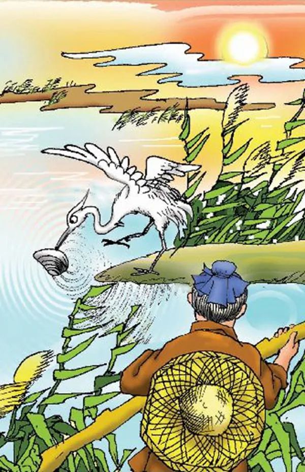 就这样,鹬和蚌相持着,谁也不让谁。正当双方筋疲力尽的时候,有个渔夫看见了,不禁喜笑颜开。他没费一点力气,就把它们一齐捉住了。