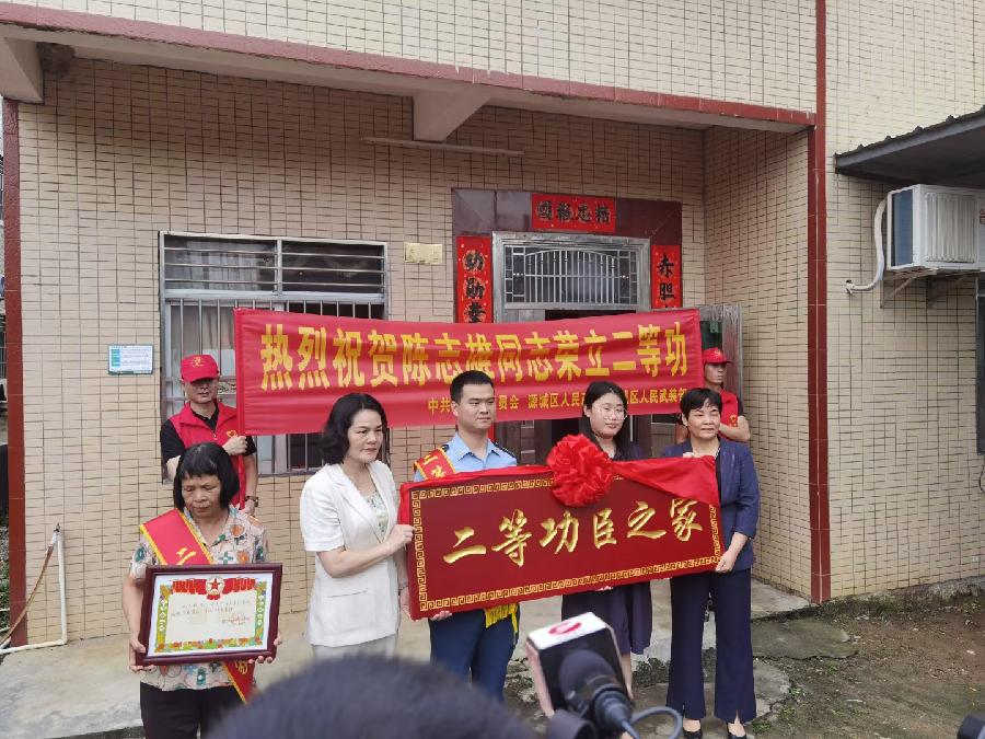 当天,送喜报小队来到陈志雄家中,为陈志雄及家属佩戴绶带,宣读立功喜报内容,颁发“二等功臣之家”牌匾,并发放立功受奖奖励金。