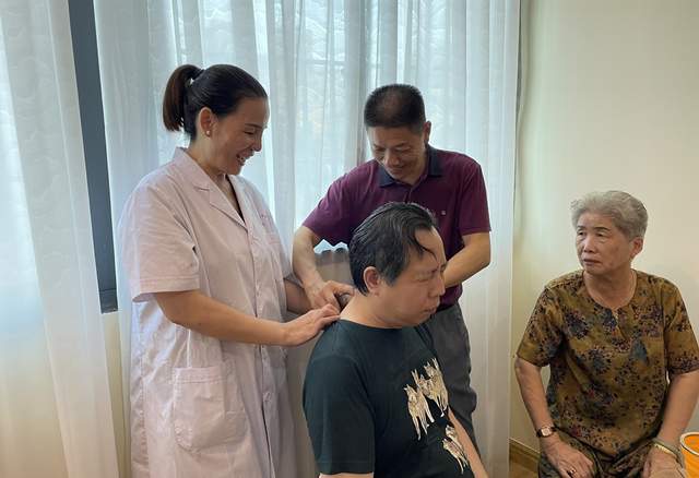 图:林云建(右2)在为王明军教授施行颈部康复理疗