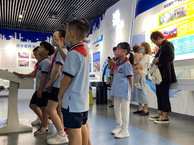 来到现代工艺展区,讲解员老师采用声、光、电相结合的多媒体展示方式,介绍了现代自来水生产、供水管网建设、水质处理等知识。讲解员讲得仔细,小队员们听得认真,遇到不懂的地方,小队员们踊跃发言提出疑问,讲解员老师都耐心做出了解答,互动过程中小队员们时刻保持着高昂的兴致,不时感叹着科技进步给我们生活带来的方便,如“黄河之水天上来”般畅快,一个个沉思的眼神中可以看到,科学用水的种子已经开始在他们内心深处发芽生长。