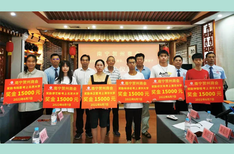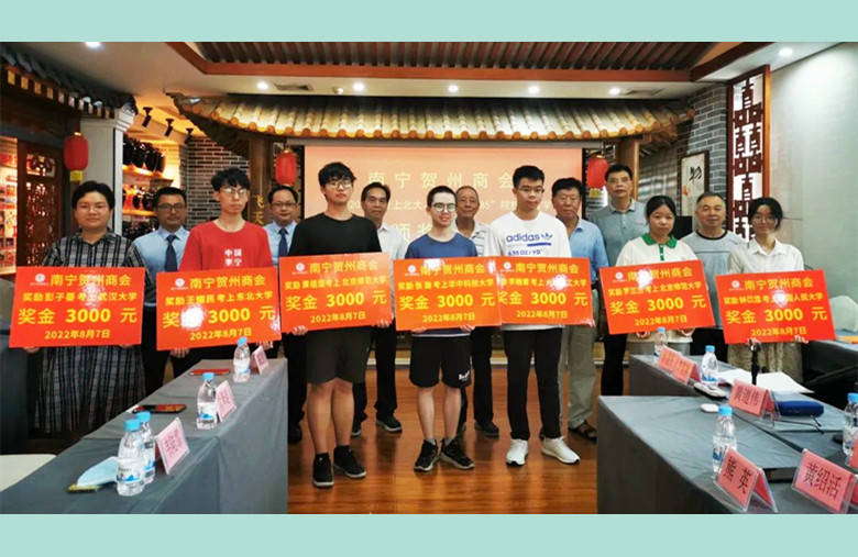 本次奖学活动是商会继去年8月份举行首次奖学活动后的第二次奖学活动。此次共奖励贺州籍考上北京大学、清华大学的学子6人,每人奖金15000元。奖励在南宁考上“985”院校的贺州籍学子7人,每人奖金3000元。奖学仪式上,黄道伟、邱石元、邵博文、黎祖庆、李美林、黄绍活、熊英、蔡树青、李世练等为获奖学子颁发了奖牌和奖金。