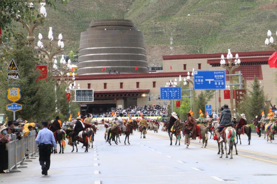1300多年前,玉树市有条"唐蕃古道",相传是一条重要的陆上丝绸之路。傍晚在玉树住宿的宾馆,还恰巧就在"茶马古道巷"一旁。复古追忆,晚饭后特地蹓了一遭。文成公主嫁给松赞干布来藏,就是走的唐蕃古道。她喜欢玉树这个地方,特地多住了几天。她到拉萨后与松赞干布做了许多大事情,为汉藏的安定与社会进步做出了贡献,并赢得了藏民的普遍爱戴。她去世后,玉树的百姓怀念她,就在附近的摩崖石刻了文成公主的雕像,建了文成公主庙。为了世世代代的持续守护,特在山口建了"禅古寺"。"文成公主"文化,已是玉树市最重要的一张历史文化名片。碰早不如碰巧。到了玉树市区,人流车流如织,还有许多警察在维持秩序。正赶上玉树举行"大美青海,江源玉树,首届玉树生态旅游节"开幕。文艺表演,车队方阵。晚上还有大型文艺晚会。气派不小,青海省,中央电视台的主持人都有亮相。夜色阑珊,还举办了特色产品展会。最吊打本人认知的是玉树的城市之美。一个偏远的小城市,竟然如此的华丽精致。文化气息扑面。在文艺晚会的广场,一座"格萨尔王"的大型铜质雕塑,引的我注目许久不想离去。下午看过,傍晚再次驻足瞻仰。