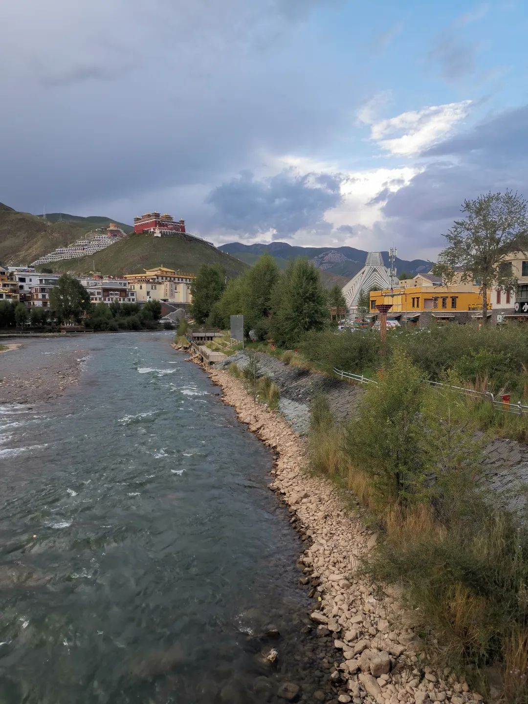 本人在巴黎卢浮宫倾慕过身披战袍的路易十四,也在圣彼得堡冬宫门前为彼得大帝威风八面的雕塑喝采。相形之下,藏人永远崇拜的英雄格萨尔王持戟握箭,神风无敌的座骑,横扫一切的王者风范。这才是天道的征服者。叹息一声,这才懂得了,什么是雕塑艺术的力量。玉树的城市真的很袖珍,但美丽的一塌糊涂。藏风的建筑一样一品,座座小楼颜色亮丽,情调十足。街道倚势而建,层叠错落。特别是高山合围,蓝天白云,绿翠夺目。正值酷暑炎热的季节,这里凉风习习,清爽宜人。太休闲太美的香巴拉。三江源之福地,中华吃水人都应向玉树致敬。