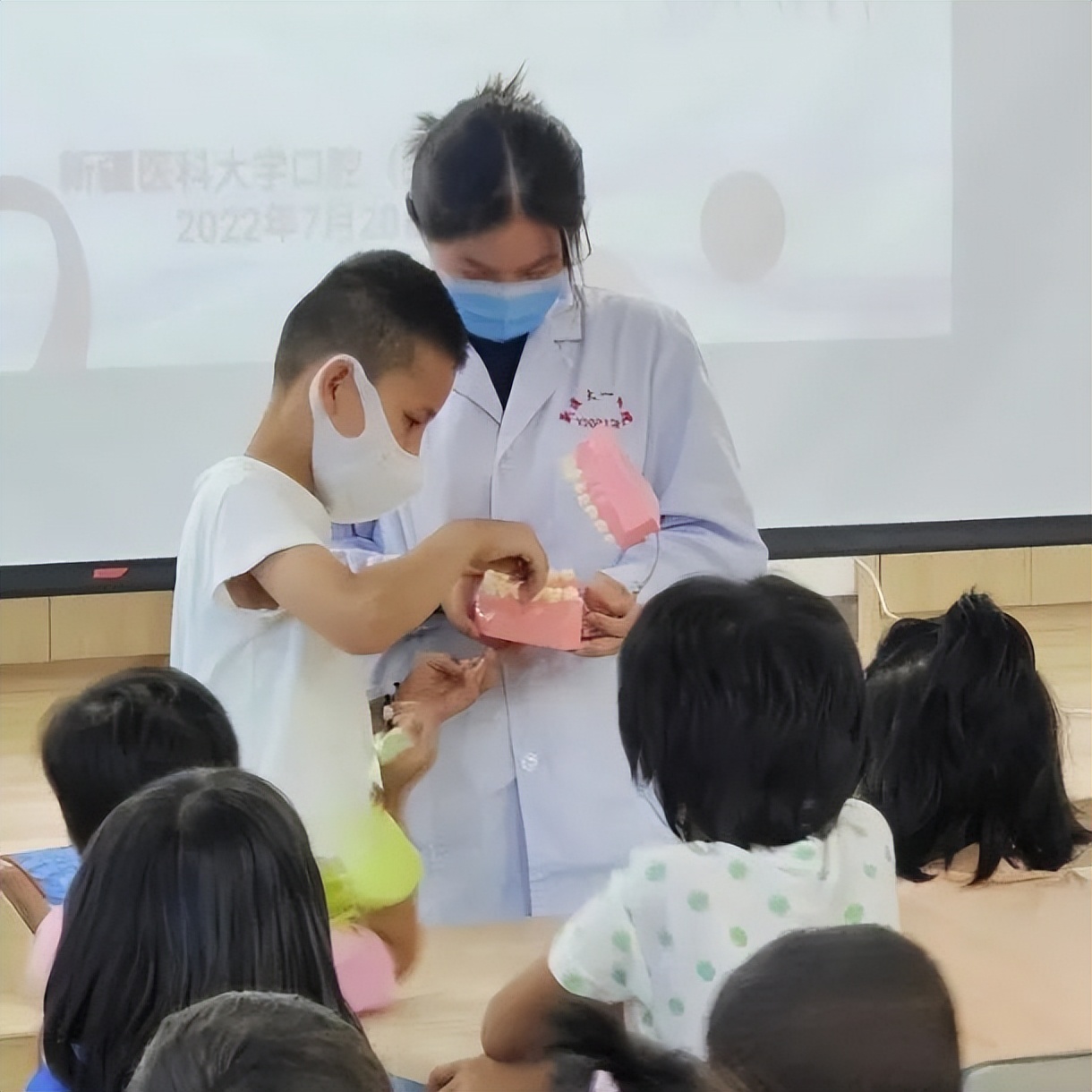 新疆医科大学口腔医学院的专业医护人员耐心地讲解了各类牙齿疾病发生的原因、症状与预防手段、日常牙齿清洁、刷牙的正确方法以及如何保护牙齿等相关常识。同时现场医护人员为小朋友们进行了口腔义诊,并针对不同的情况给出了专业的护牙保洁意见,倡导大家注意牙齿及口腔的日常保健,如发生口腔疾病一定要重视并到正规的大医院及时就医。
