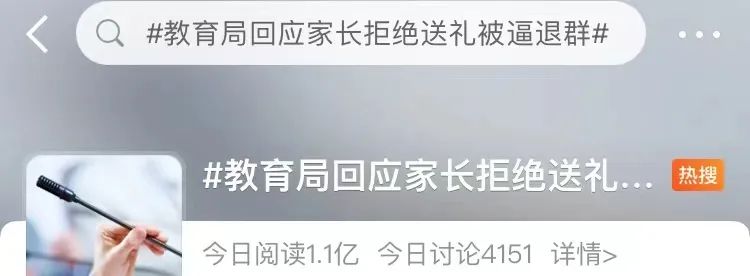 9月7日,“教育局回应家长拒绝送礼被逼退群”的话题冲上热搜。因拒绝凑钱给老师送礼