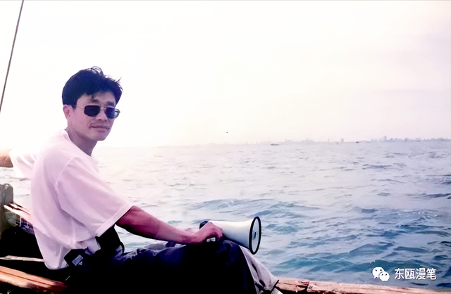 1998年6月19日,在琼州海峡的小渔船上一边采访,一边兼顾救生。