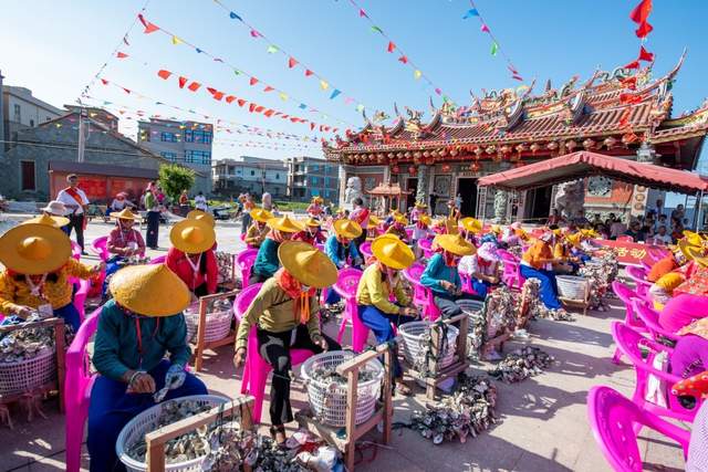 净峰镇墩南村渔村文化广场,这里距离惠女湾沙滩仅10多米,海天一色,景色旖旎。广场汇集了来自各个村的参赛选手,选手们身穿惠安女服饰,头戴黄斗笠,场面艳丽多彩。参赛者有老有少,年轻一辈跃跃欲试,想用旺盛的精力拔得头筹。年长的一辈则从容不迫,她们有着丰富的经验,并不怕年轻人的挑战。