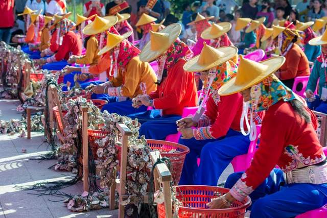 这场惠女渔具传统手工制作比赛活动,有两项内容,一是制作海蛎串壳,二是编织渔网,共有50名老少女性参赛。