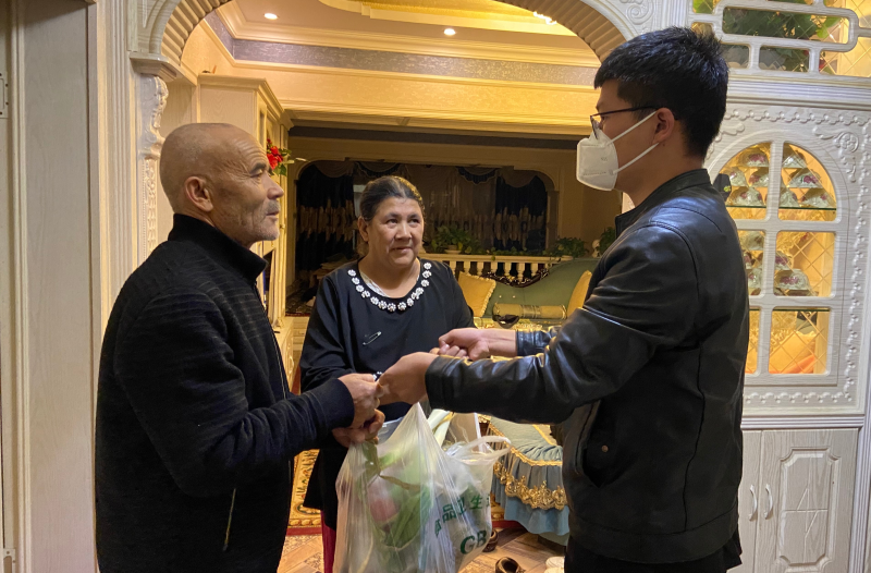 收到“爱心”蔬菜包的吾斯曼·阿巴拜克格外开心。他家里有三口人,女儿上学后,家里只剩两人,而且爱人患有糖尿病,生活比较拮据。李帅得知情况后,经常给他们送去一些生活用品。久而久之,他们之间相处得像一家人。