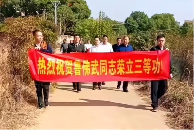 据了解,作为“全国拥军爱民先进县市” 的武穴市,长期高度重视拥军工作,让荣誉不再“静悄悄”,立功战士家门口,立竿见影成了“祝贺现场”。接着看,热烈祝贺鲁佛武同志荣立三等功!送立功喜报的队伍有的拉着横幅,有的捧着喜报,有的敲锣打鼓,一路喜庆地走进军属家门。