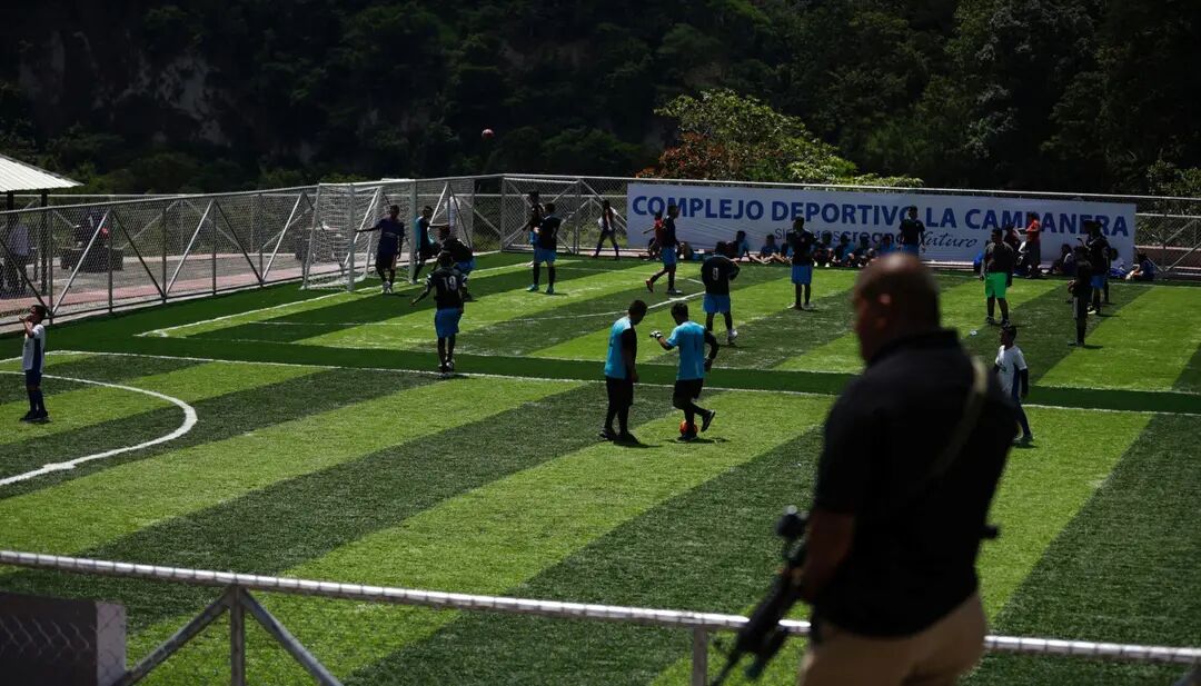图为萨尔瓦多坎帕内拉(La Campanera),年轻人在球踢球。该社区是出名的黑帮、犯罪组织根据地。