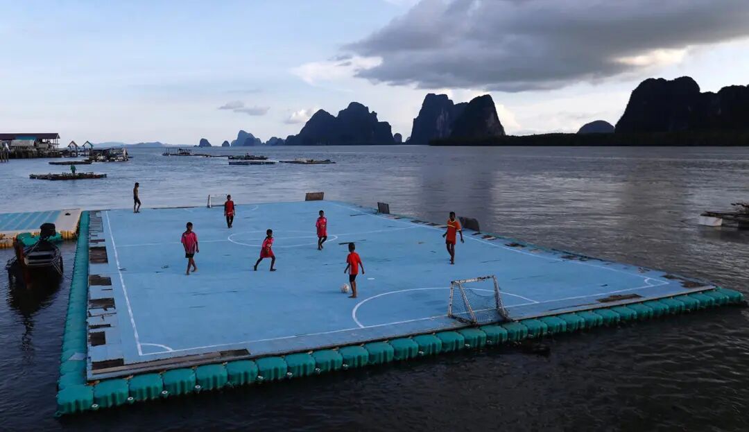 图为泰国攀易岛(Ko Panyi),小朋友在浮在水面上的球场踢球。