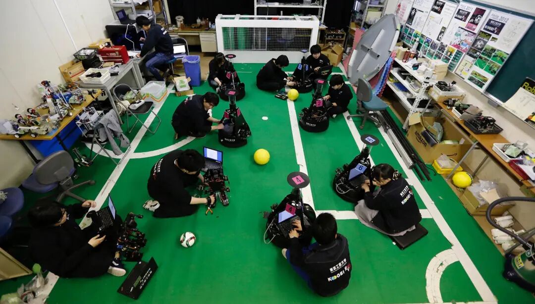 图为日本厚木市,东京工艺大学的学生正检查他们研发的足球机械人。