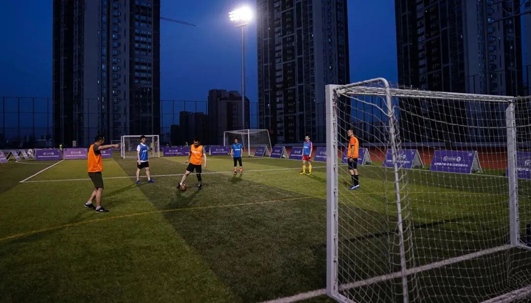 图为中国上海,人们在一个天台球场踢球。