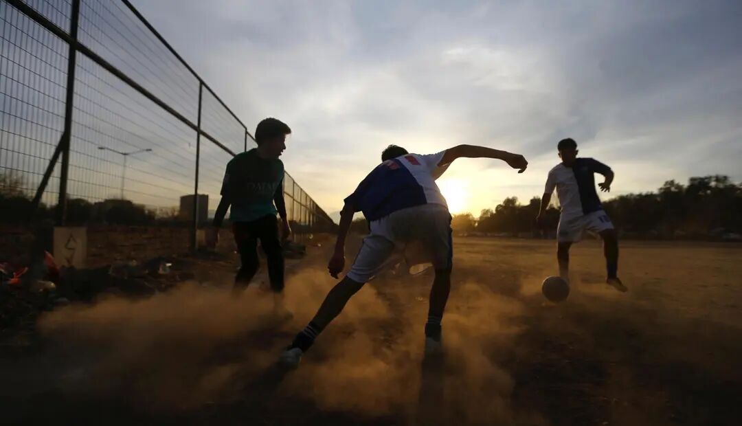 图为智利圣地亚哥,年轻人在沙尘滚滚的球场踢球。